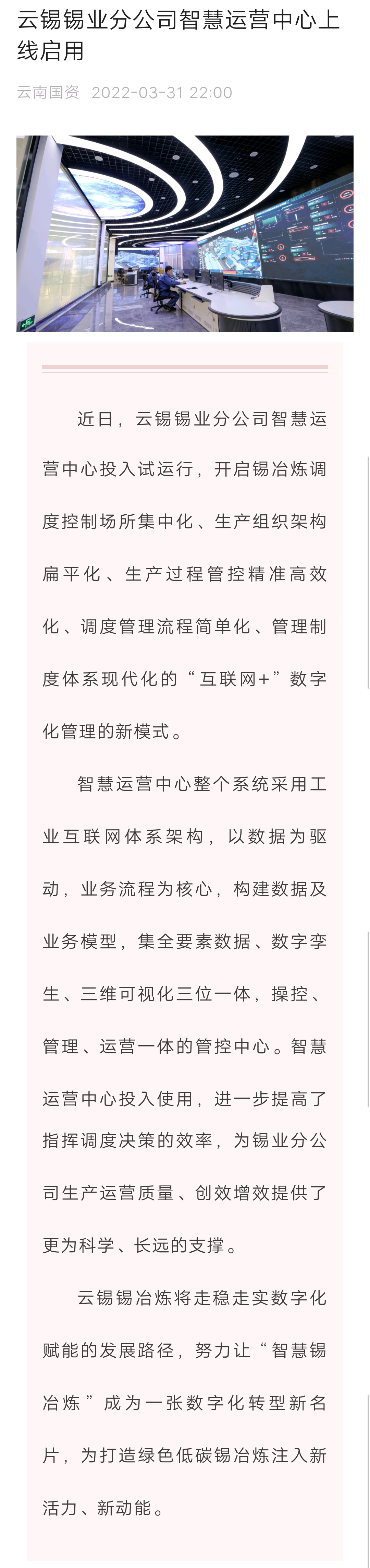 云南国资:云锡锡业分公司智慧运营中心上线启用