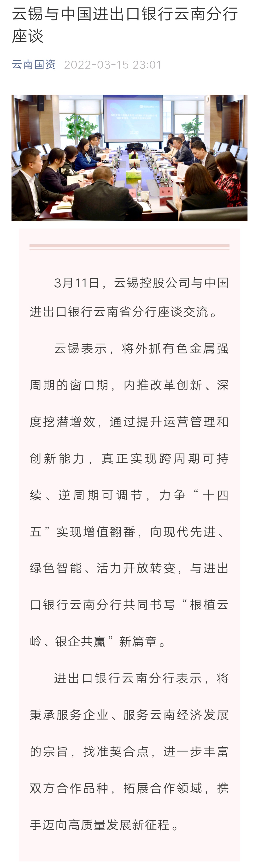 云南国资:云锡与中国进出口银行云南分行座谈