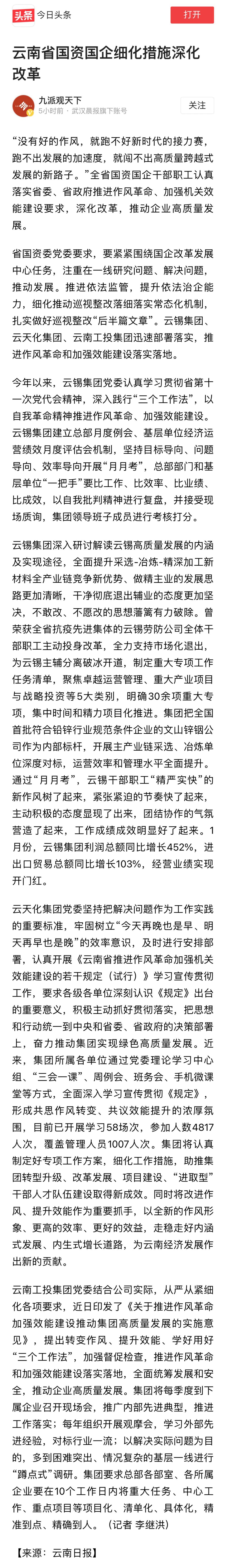 云南日报、今日头条:云南省国资国企细化措施深化改革