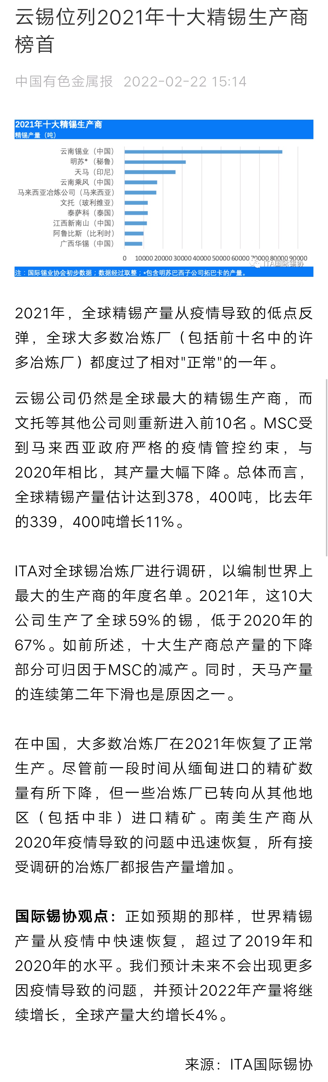 ITA国际锡协:云锡位列2021年十大精锡生产商榜首