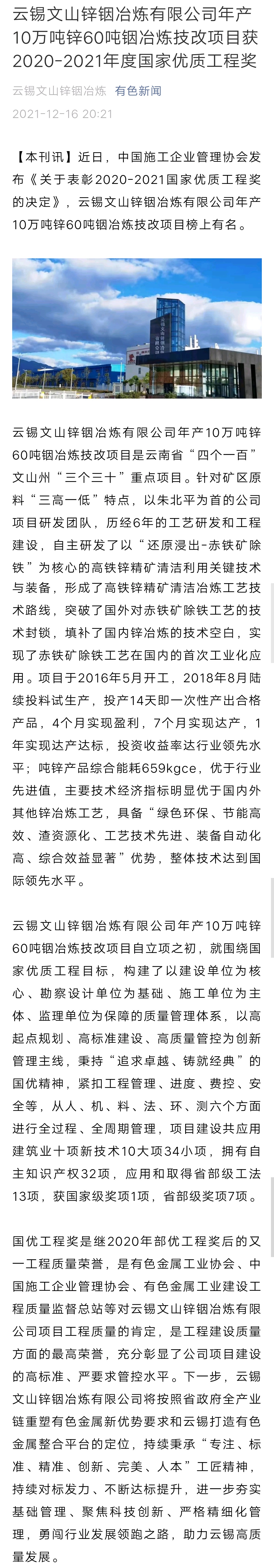 【 有色新闻】云锡文山锌铟冶炼有限公司年产10万吨锌60吨铟冶炼技改项目获2020-2021年度国家优质工程奖