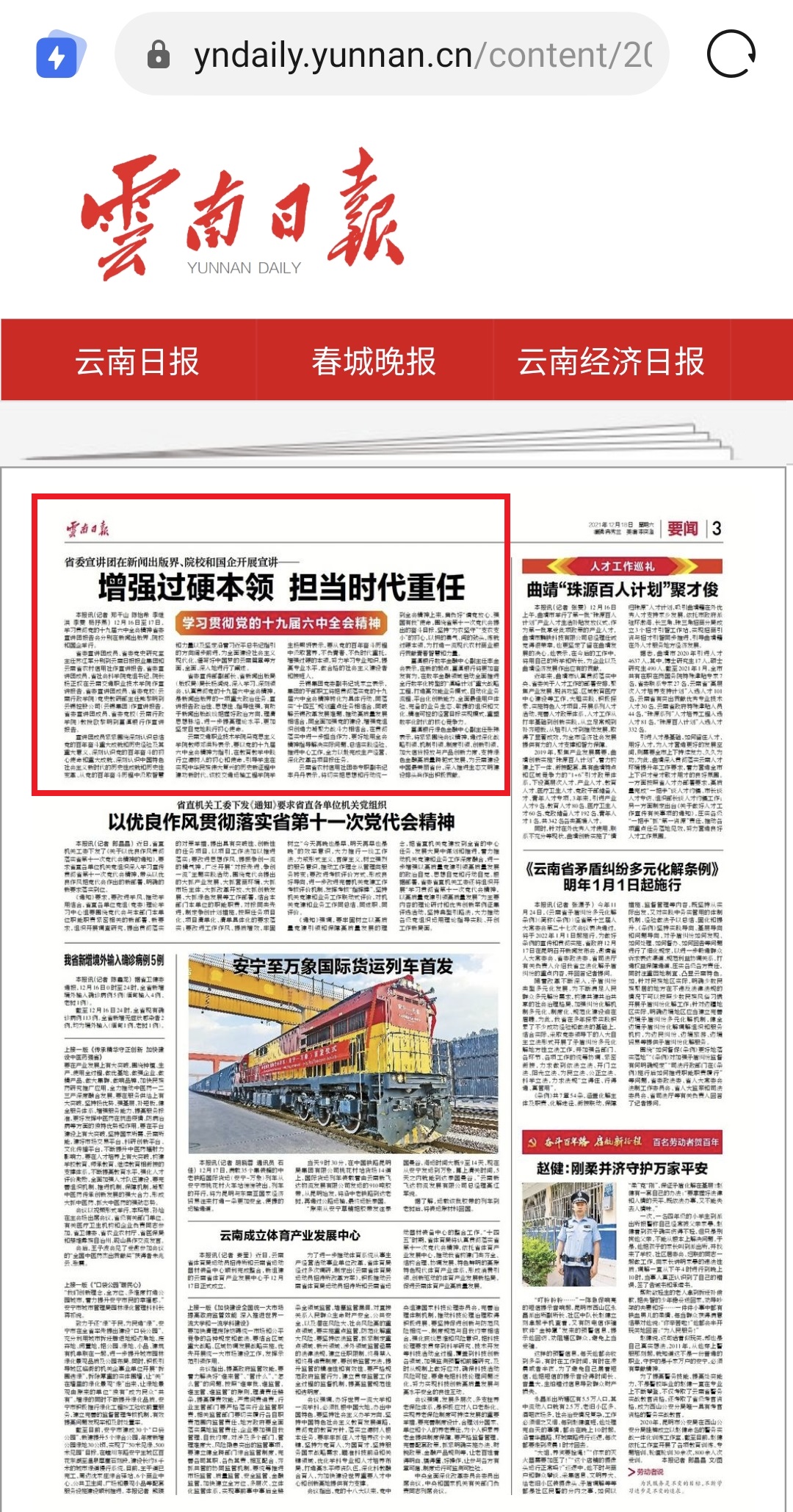 云锡集团党委副书记姚家立表示,集团的干部职工将把贯彻落实党的十九届六中全会精神转化为具体行动,同落实“十四五”规划重点任务相结合,同破解云锡改革发展难题、推动高质量发展相结合,同全面加强党的建设、增强党组织创造力凝聚力战斗力相结合,在贯彻落实中进一步担当作为,更好地用全会精神指导解决实际问题、总结实践经验、推进中心工作,全力以赴完成生产经营、深化改革各项目标任务。