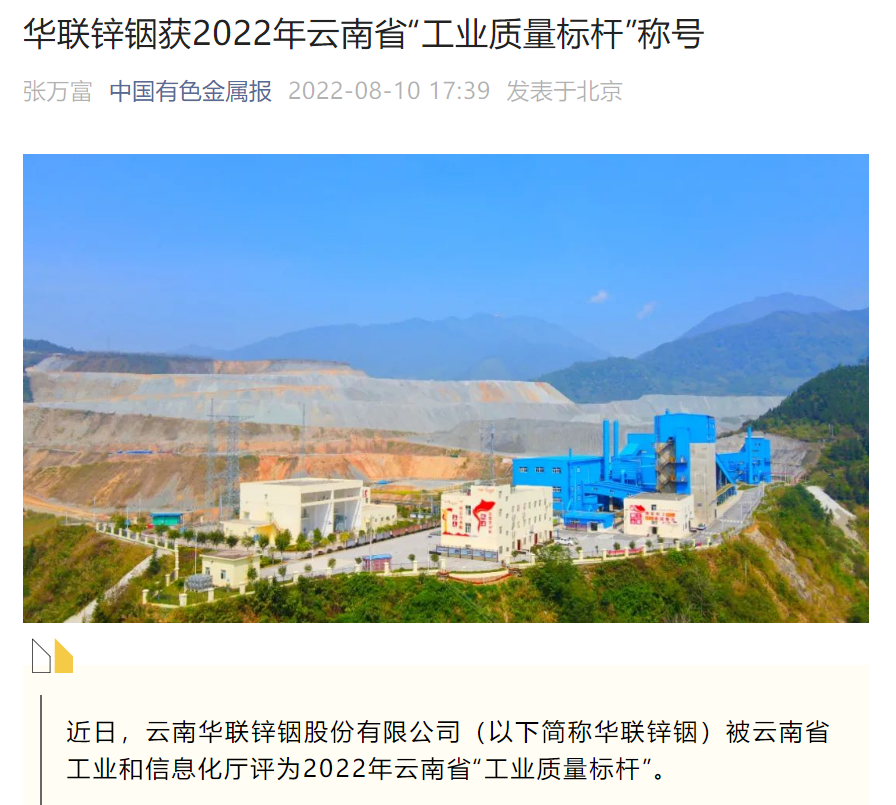 新华网、云南政协、中国有色报、文旅头条:华联锌铟获2022年云南省“工业质量标杆”称号