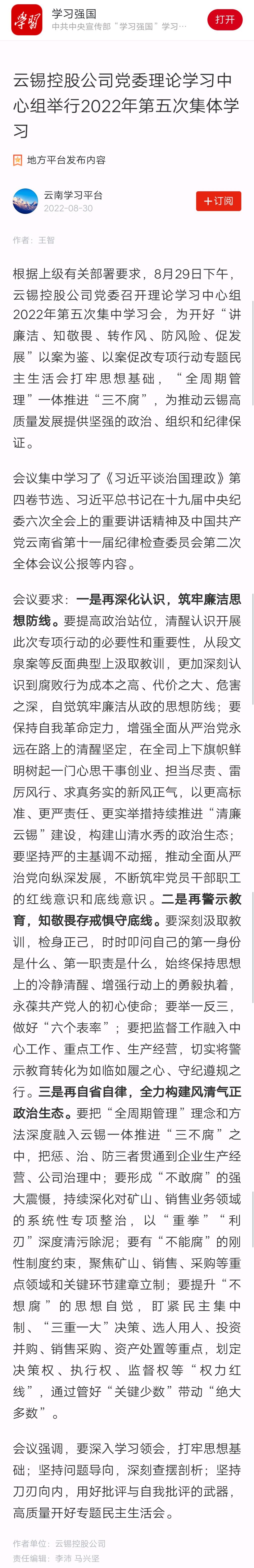 学习强国:云锡控股公司党委理论学习中心组举行2022年第五次集体学习