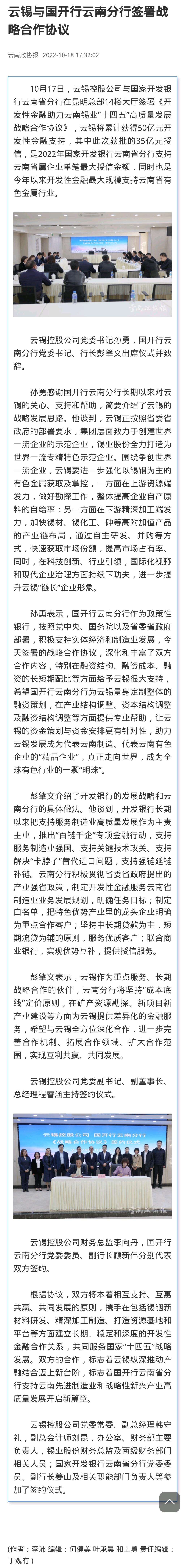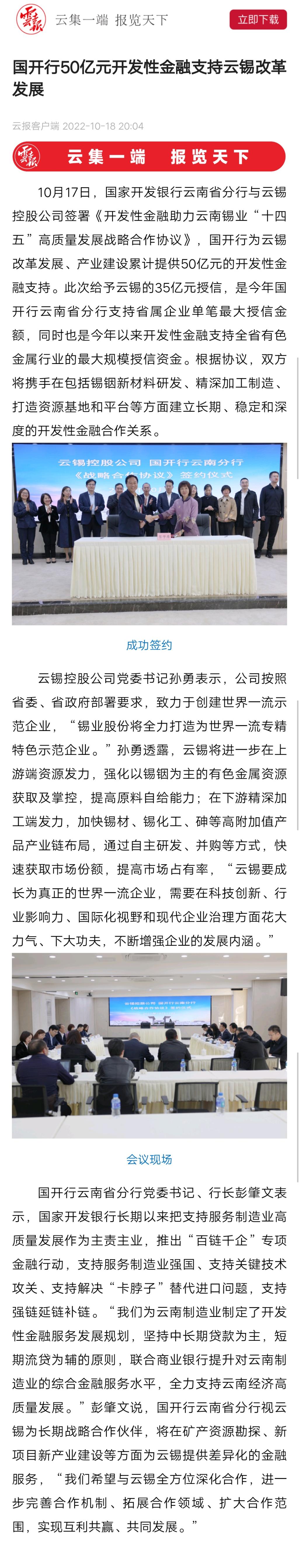 云南政协、云报客户端、中国有色金属报:云锡与国开行云南分行签署战略合作协议