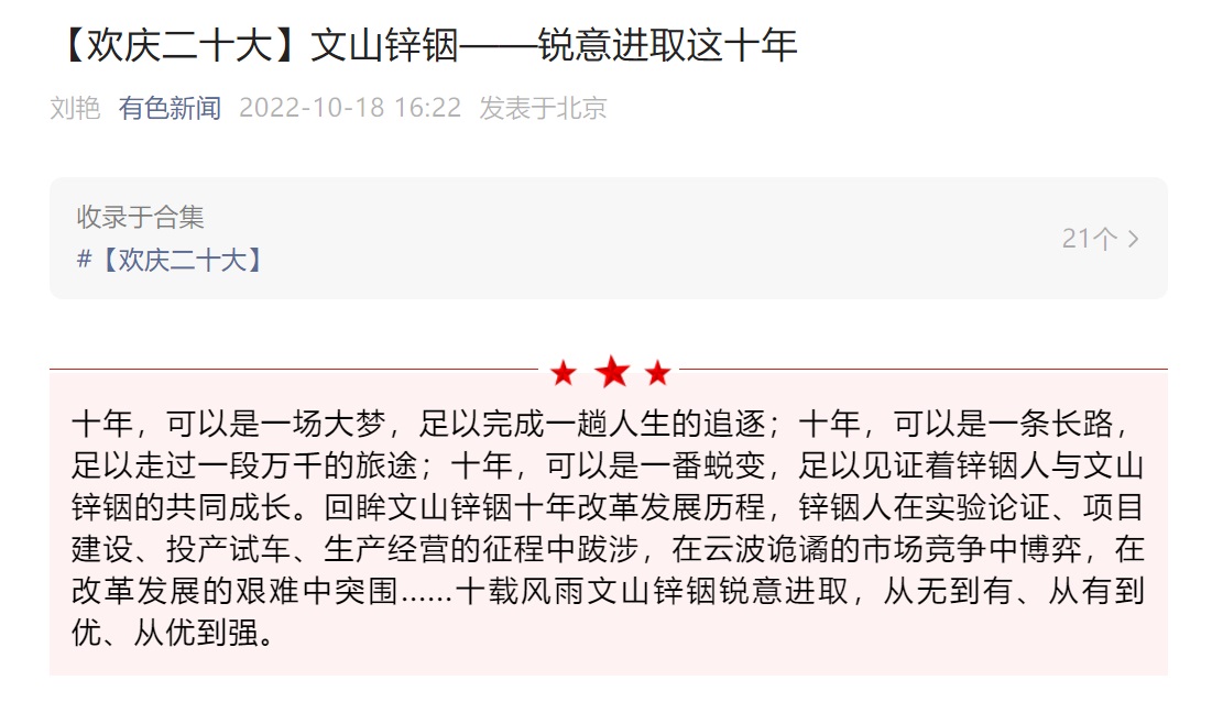 有色新闻、文旅头条:云锡文山锌铟锐意进取这十年