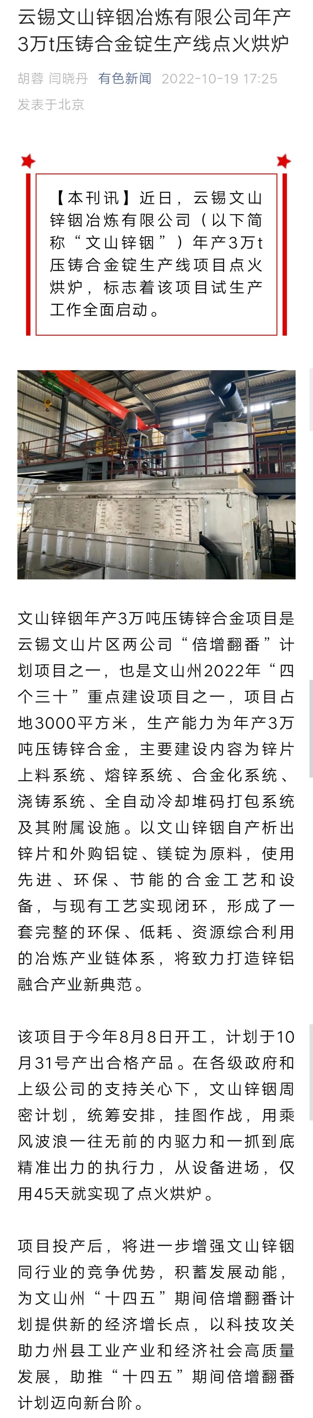 有色新闻:云锡文山锌铟冶炼有限公司年产3万t压铸合金锭生产线点火烘炉