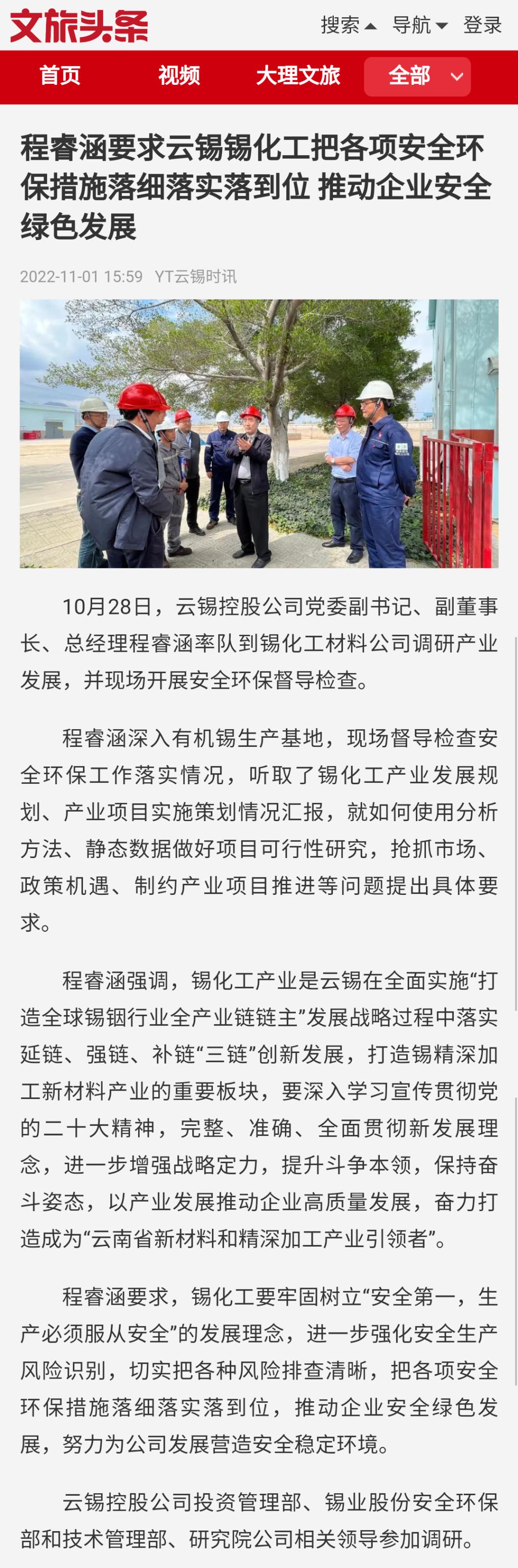 文旅头条:程睿涵要求云锡锡化工把各项安全环保措施落细落实落到位 推动企业安全绿色发展