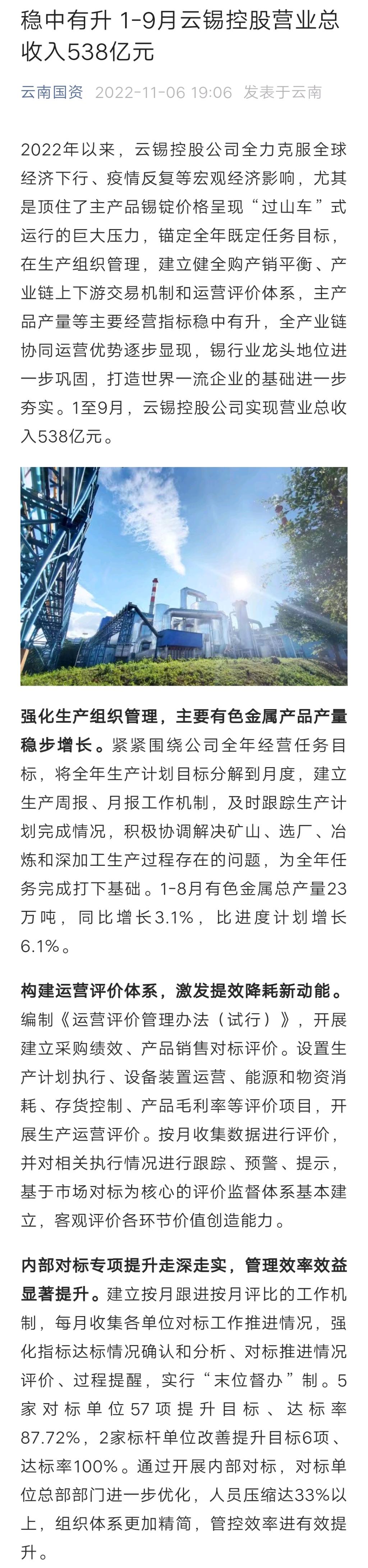 云南国资:稳中有升 1-9月云锡控股营业总收入538亿元