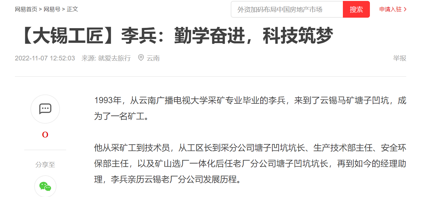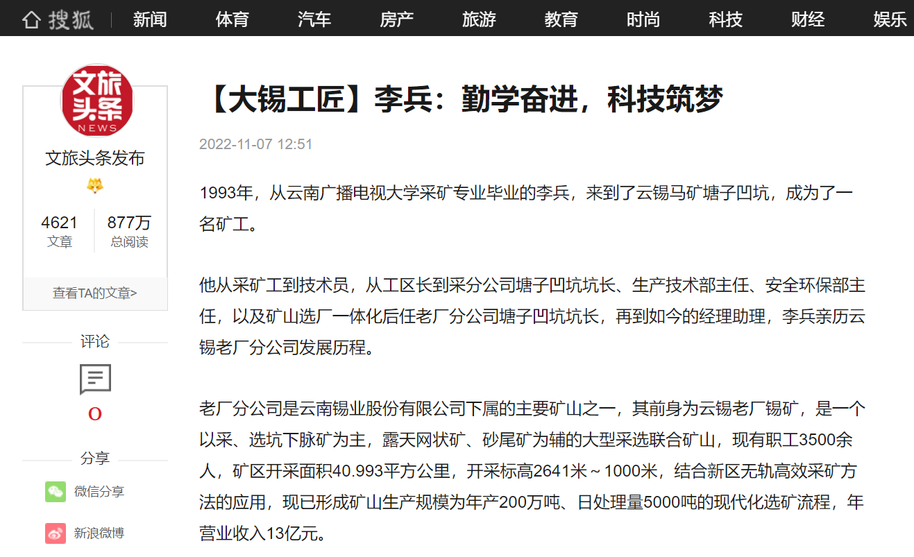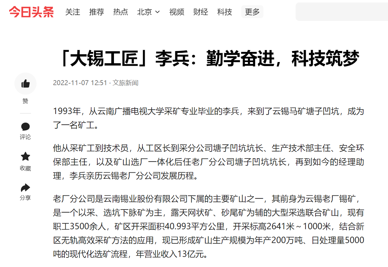 今日头条、网易、一点资讯、搜狐、文旅头条:【大锡工匠】李兵:勤学奋进,科技筑梦