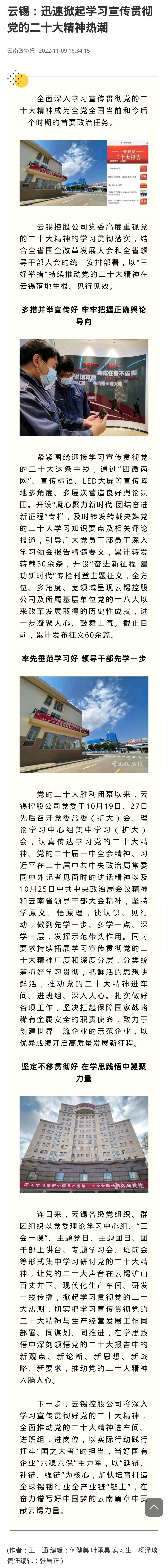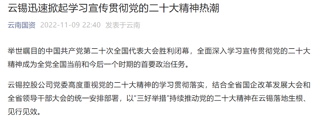 云南国资、云南政协报:云锡迅速掀起学习宣传贯彻党的二十大精神热潮