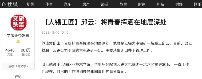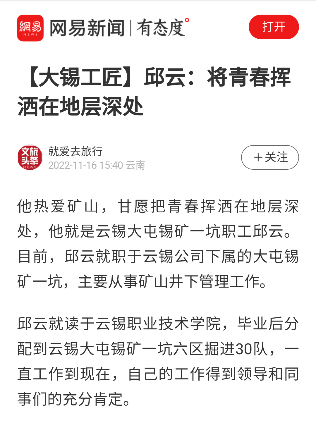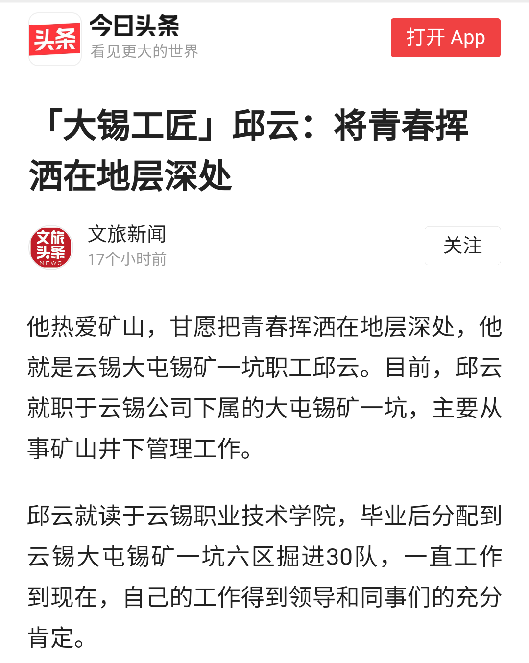 今日头条、网易、搜狐、百度、文旅头条:【大锡工匠】邱云:将青春挥洒在地层深处