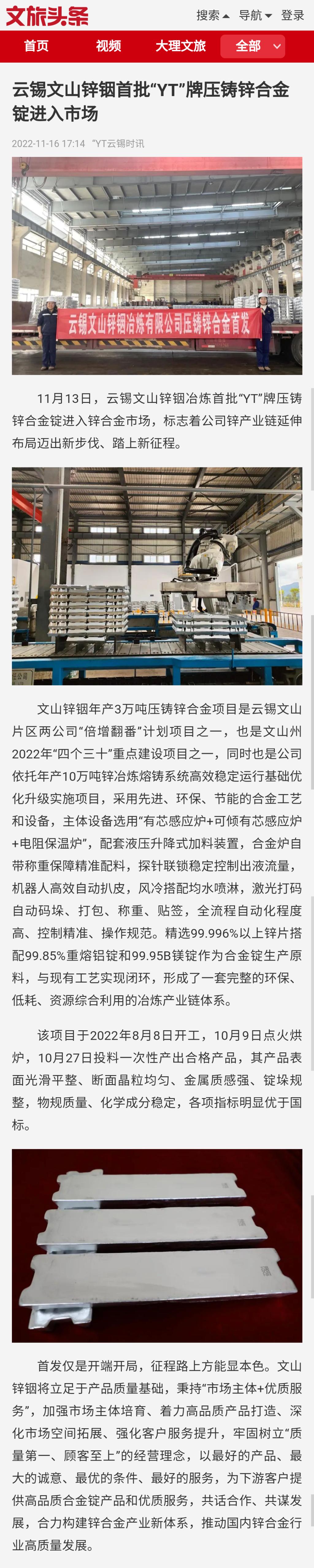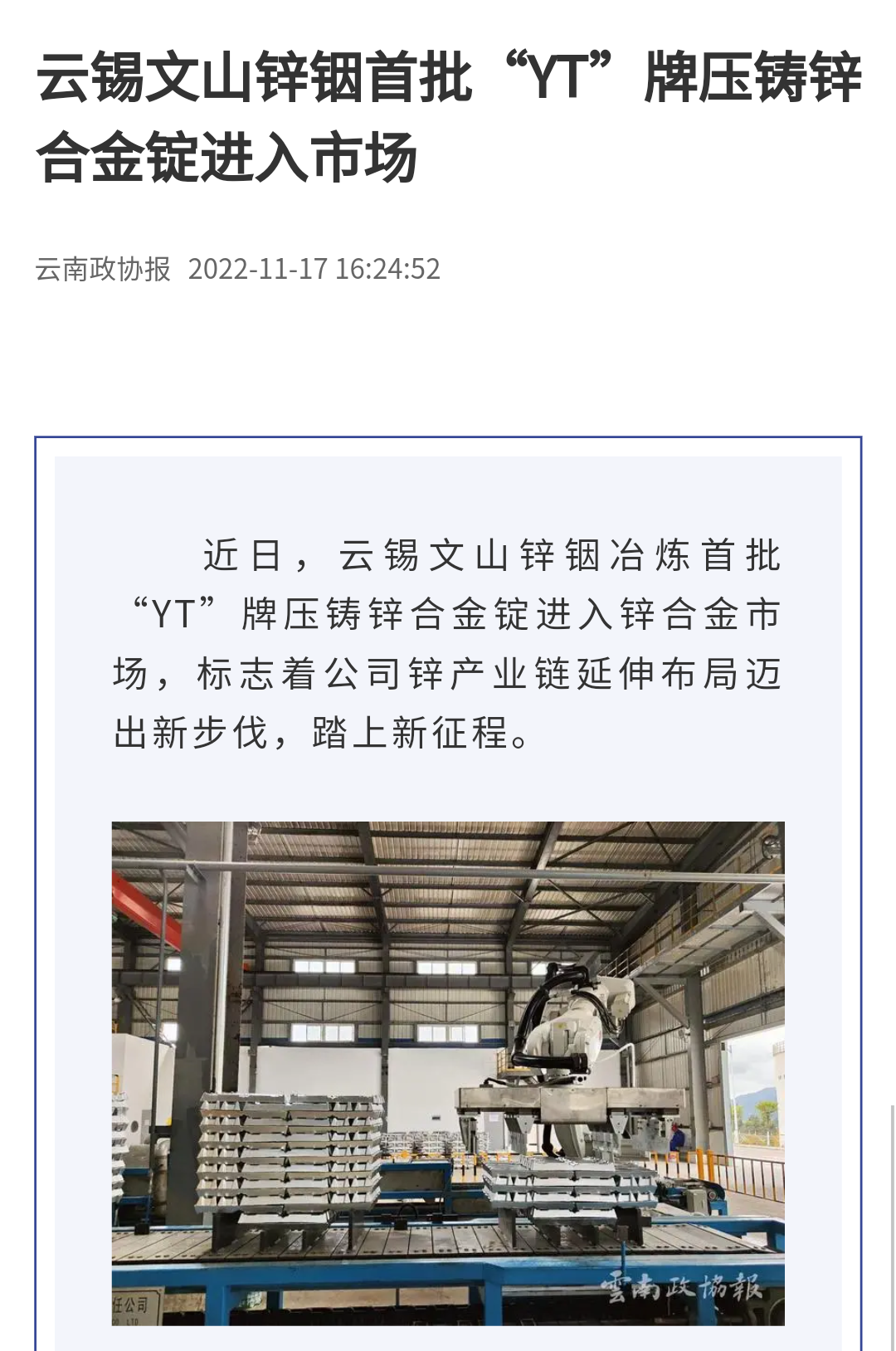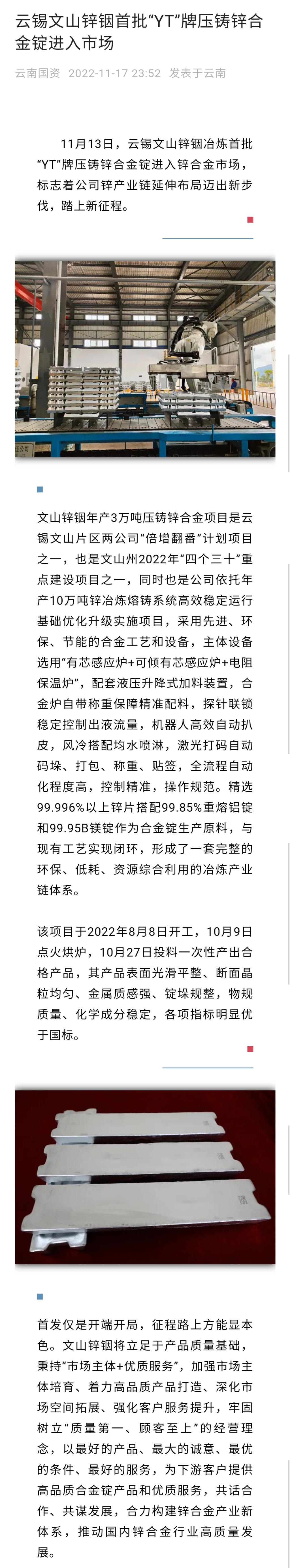 云南国资、云南政协报、中国有色金属报、文旅头条:云锡文山锌铟首批“YT”牌压铸锌合金锭进入市场