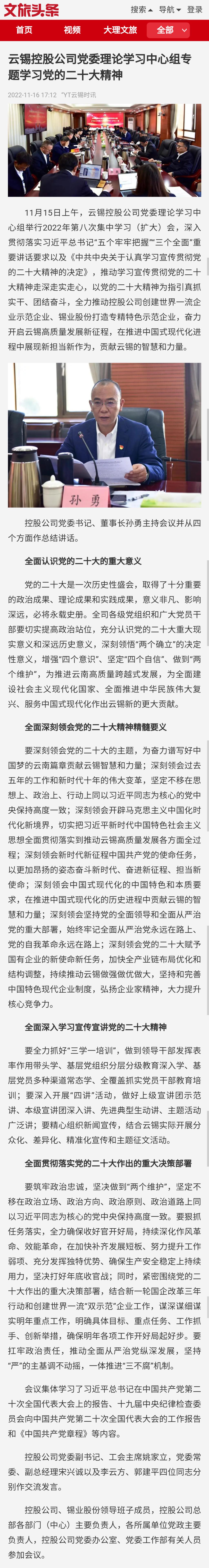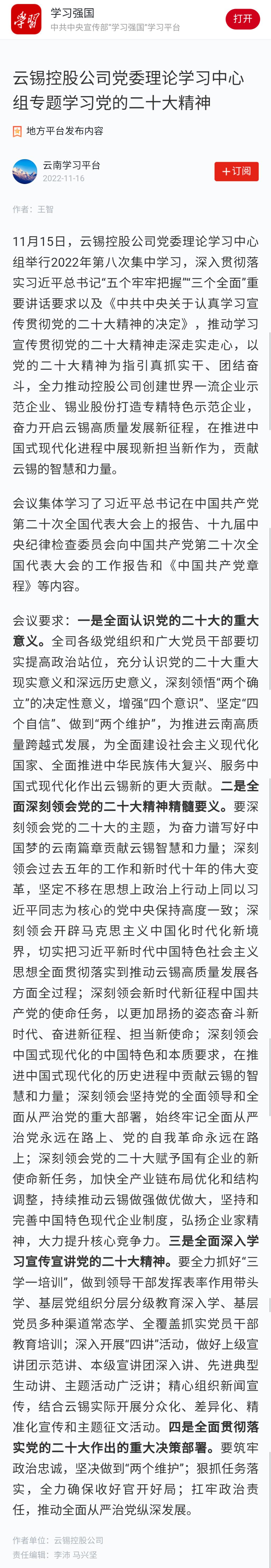学习强国、文旅头条:云锡控股公司党委理论学习中心组专题学习党的二十大精神