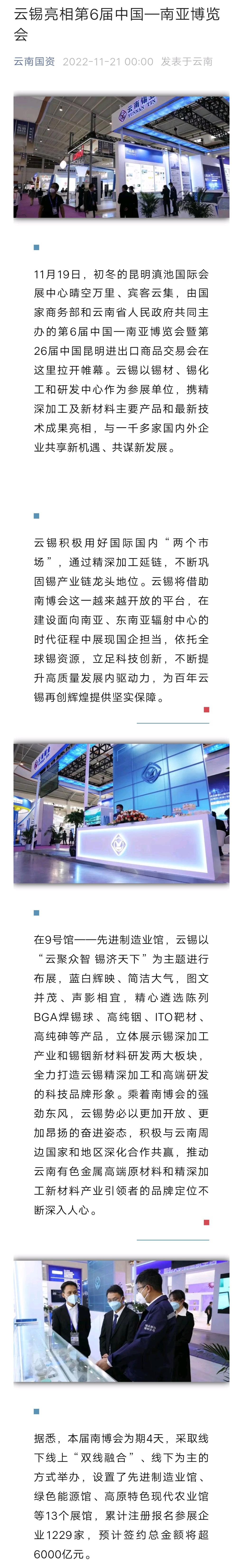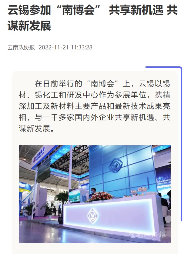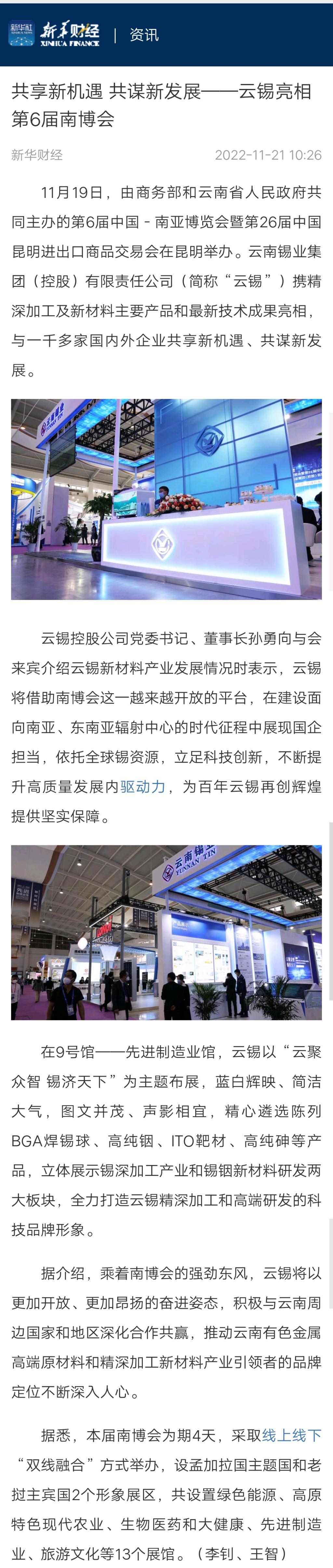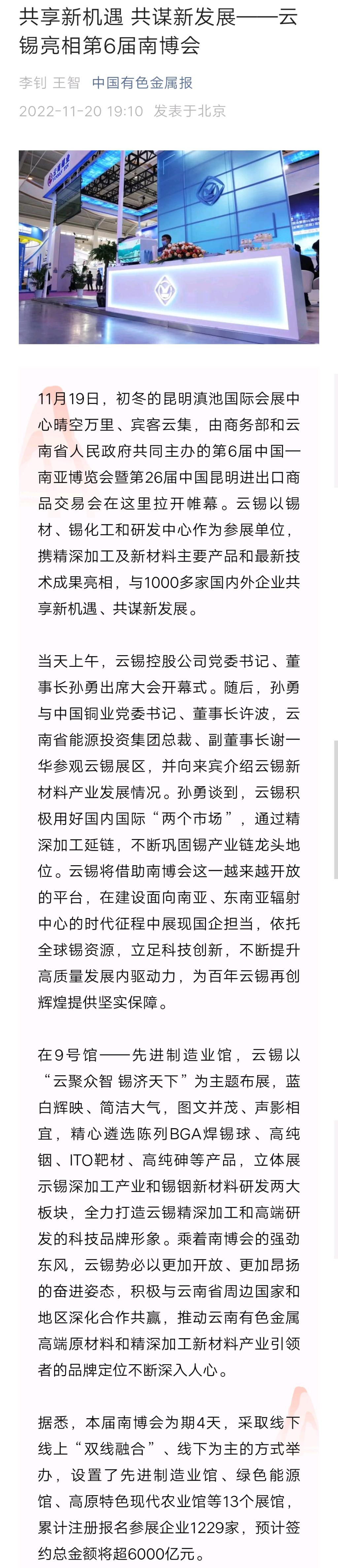 新华财经、云南国资、云南政协报、中国有色金属报、文旅头条:共享新机遇 共谋新发展——云锡亮相第6届南博会