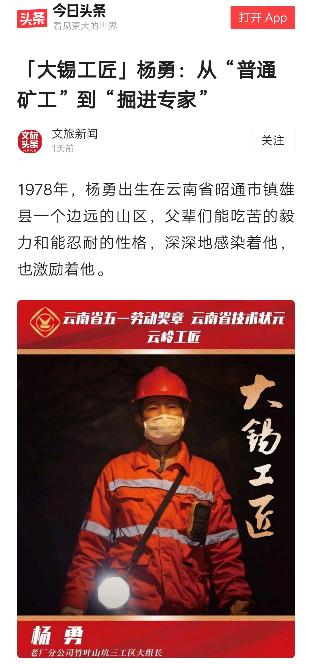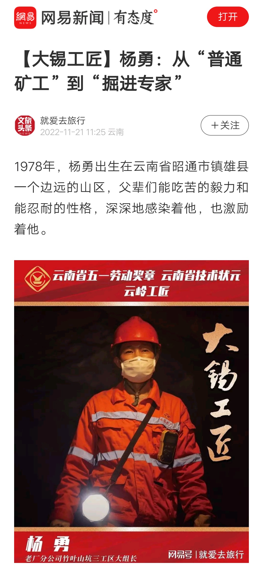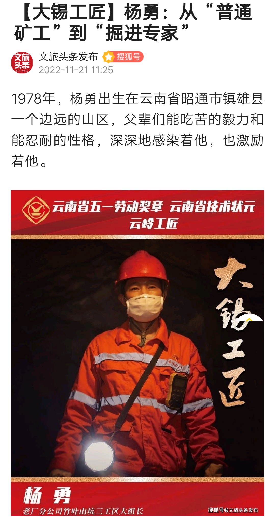 今日头条、网易、搜狐、一点资讯、大鱼号、文旅头条:【大锡工匠】杨勇:从“普通矿工”到“掘进专家”