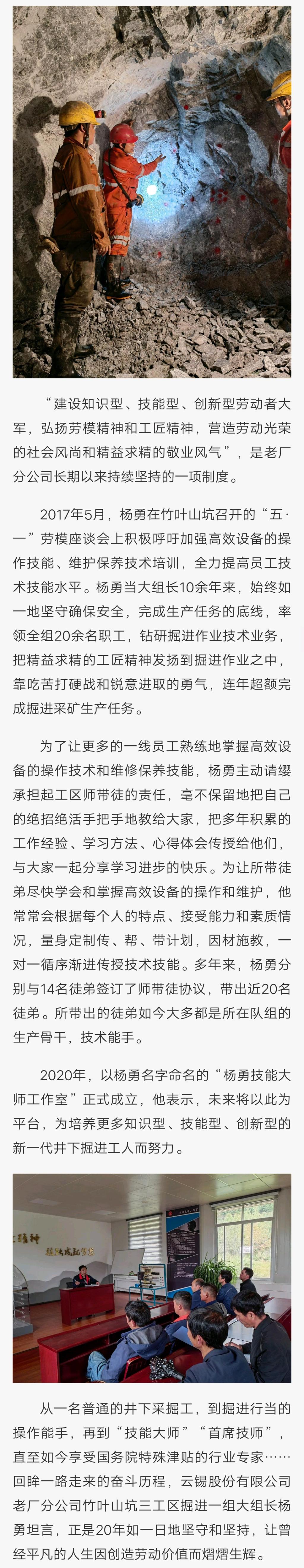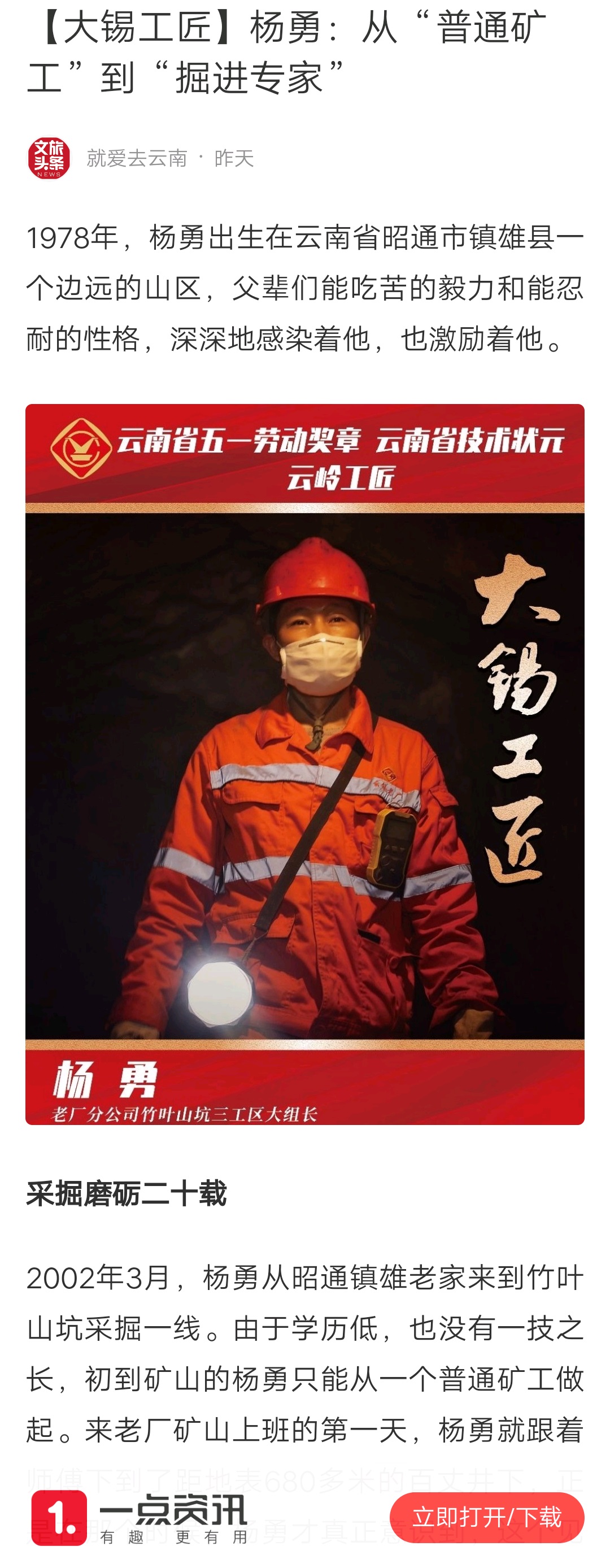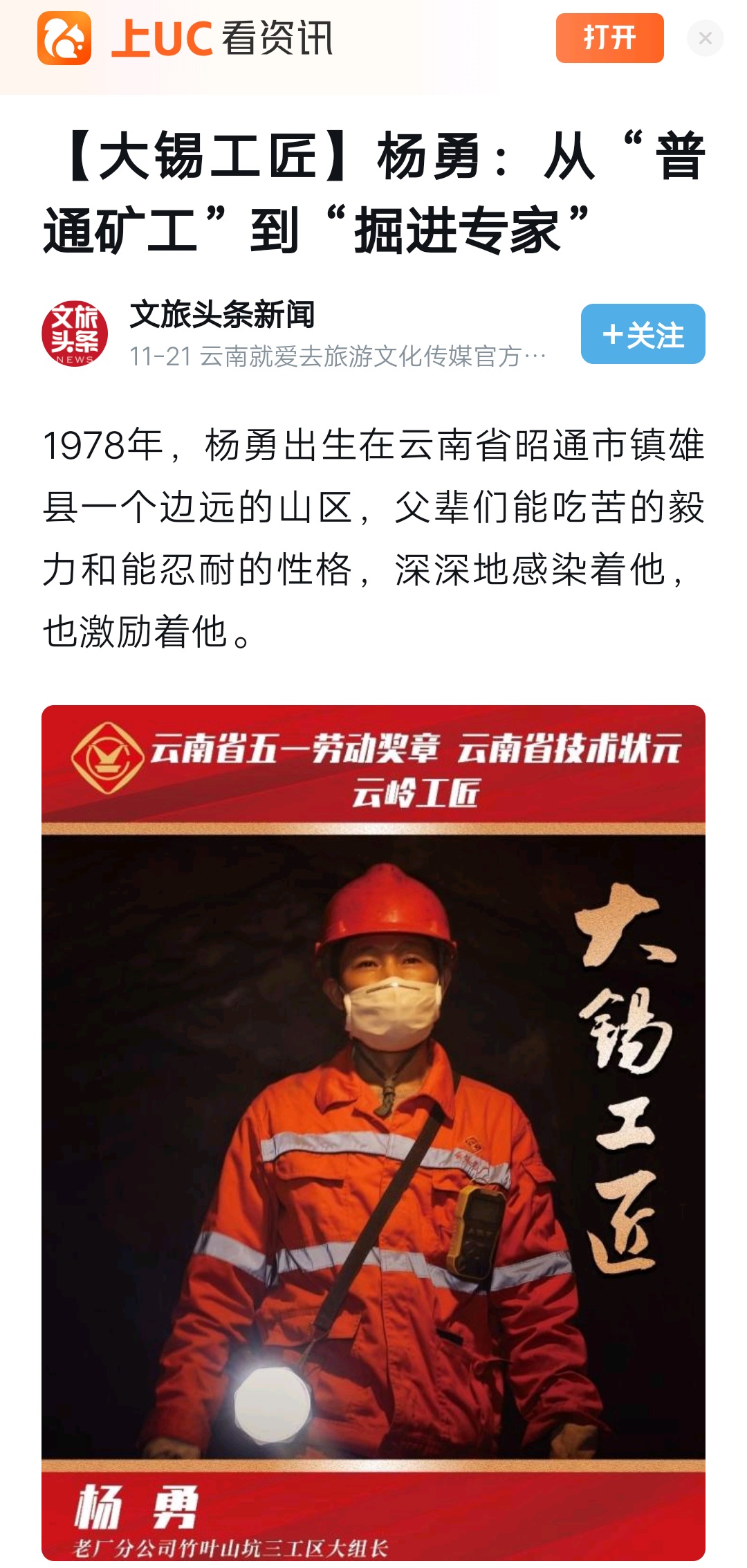 今日头条、网易、搜狐、一点资讯、大鱼号、文旅头条:【大锡工匠】杨勇:从“普通矿工”到“掘进专家”