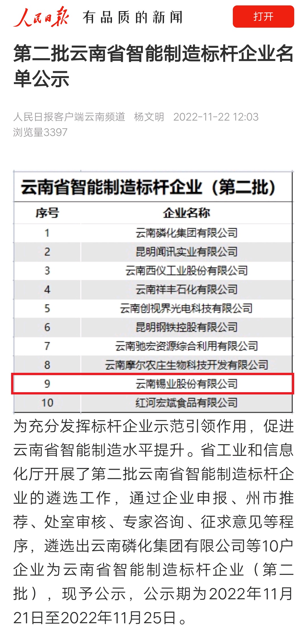 人民日报客户端:第二批云南省智能制造标杆企业名单公示