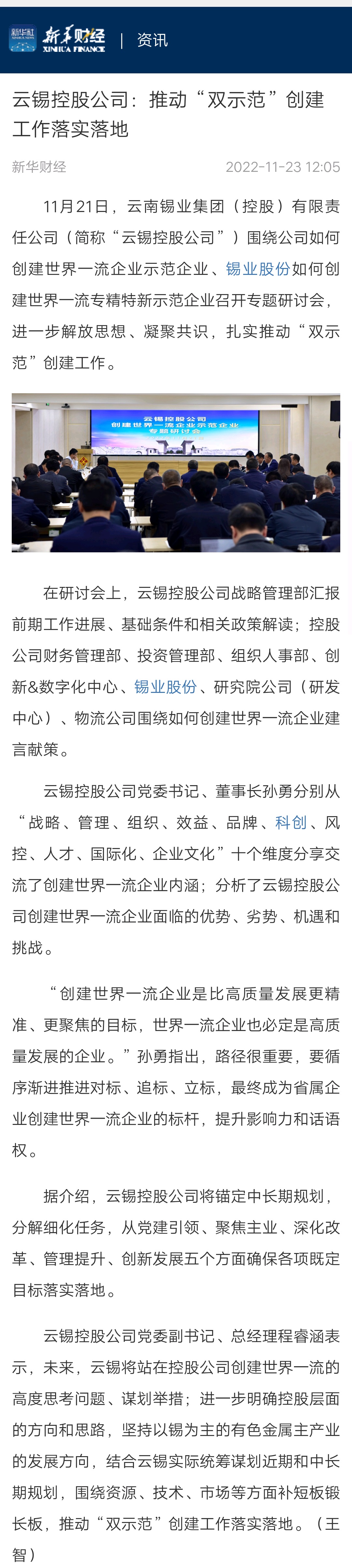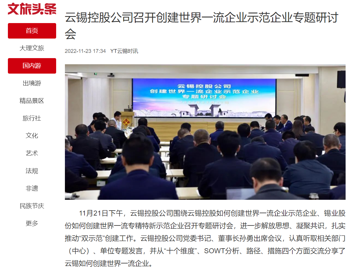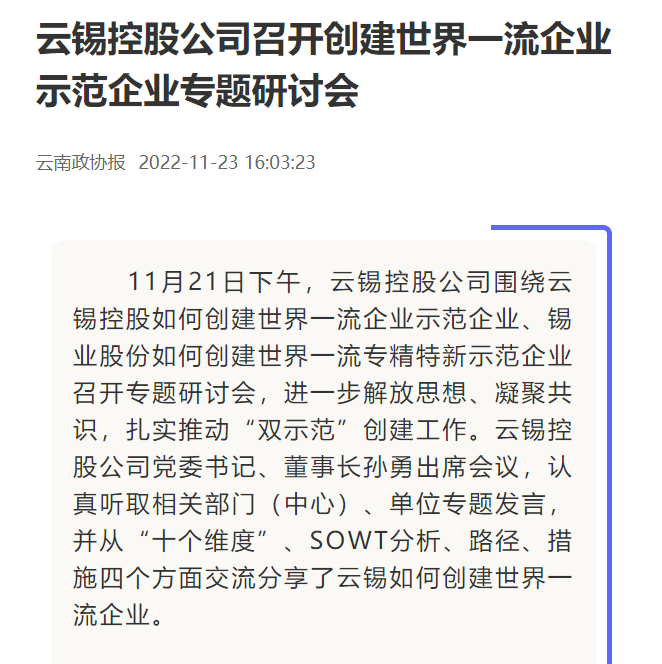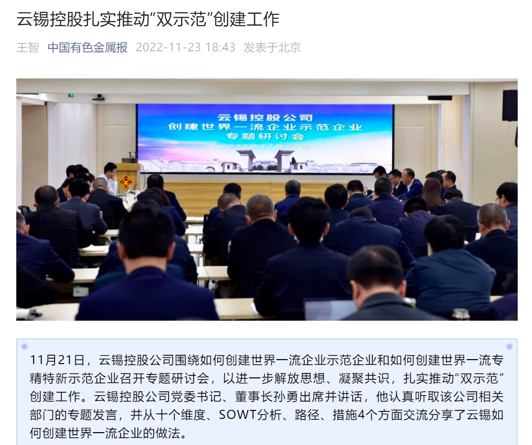 新华财经、云南政协报、中国有色金属报、文旅头条:云锡控股公司推动“双示范”创建工作落实落地