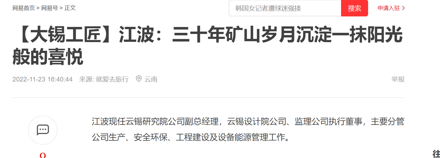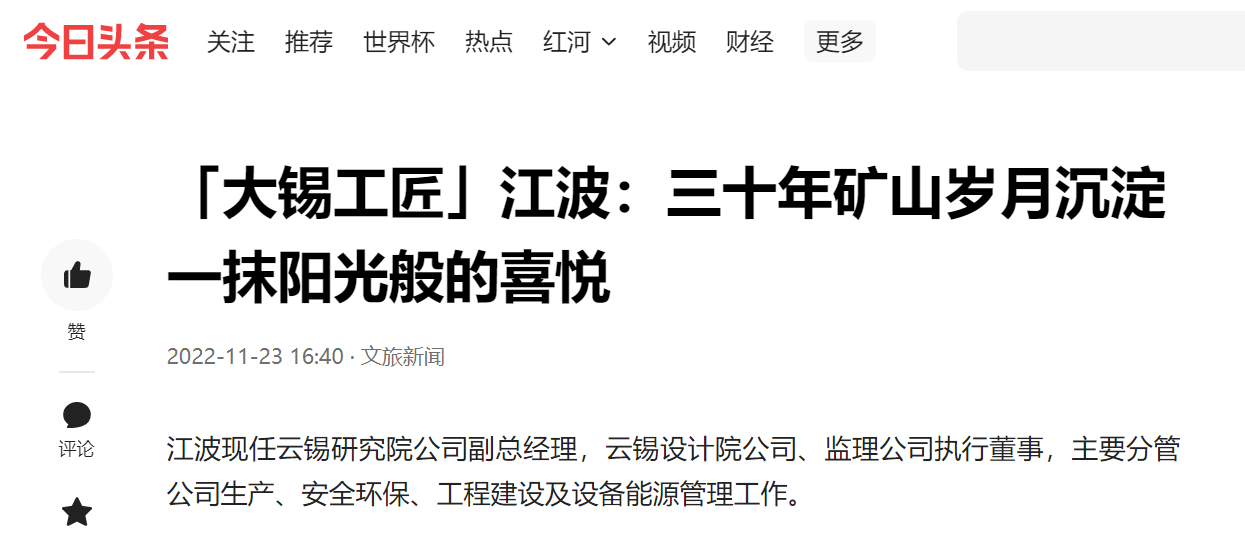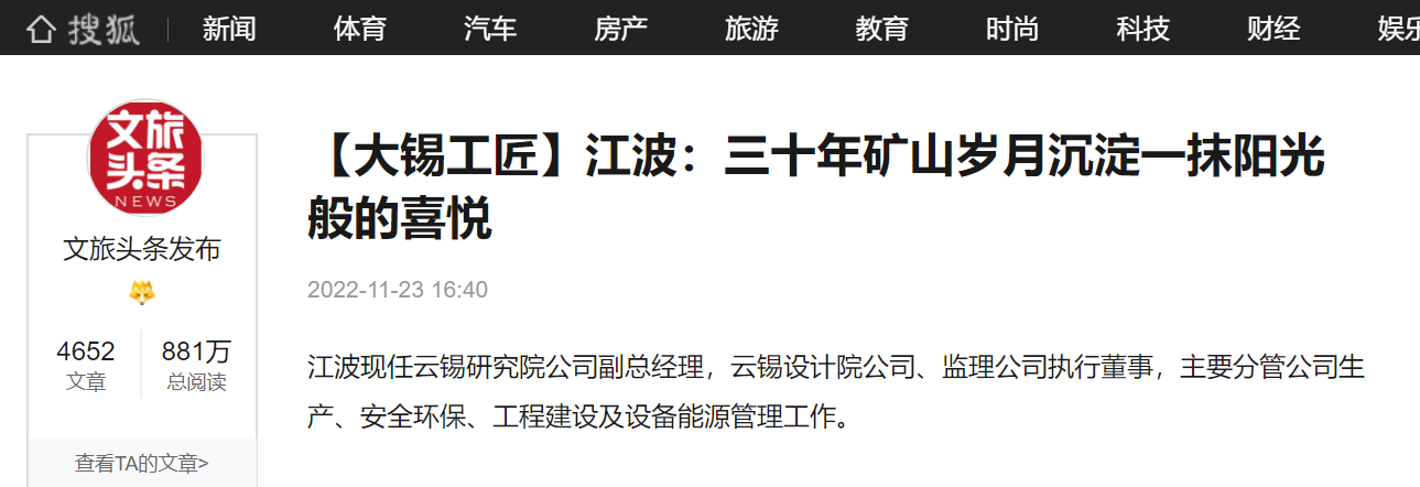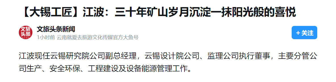 今日头条、网易、搜狐、大鱼号、文旅头条:【大锡工匠】江波:三十年矿山岁月沉淀一抹阳光般的喜悦