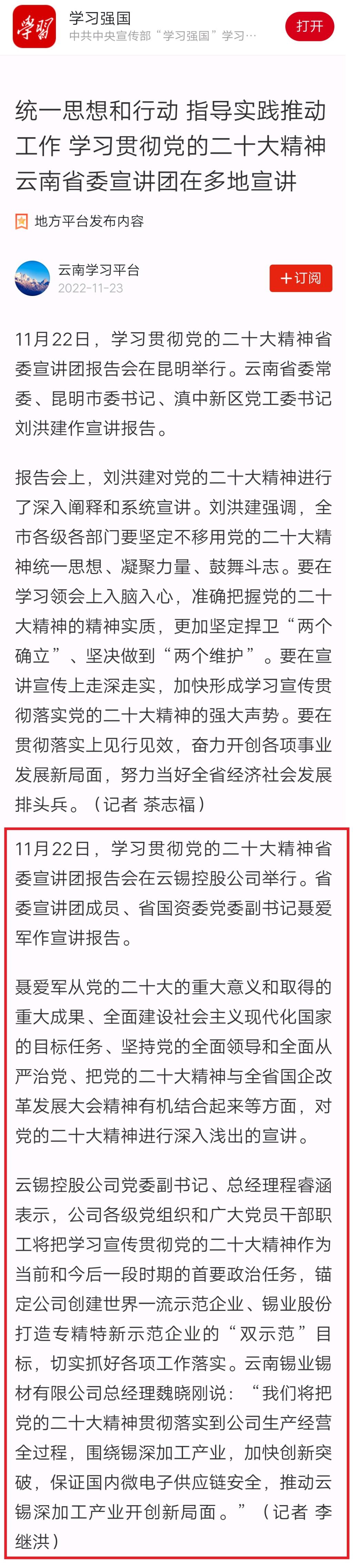 学习强国:统一思想和行动 指导实践推动工作 学习贯彻党的二十大精神云南省委宣讲团在多地宣讲