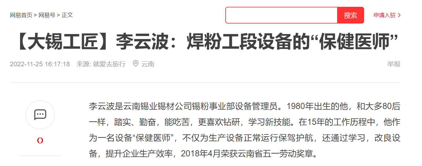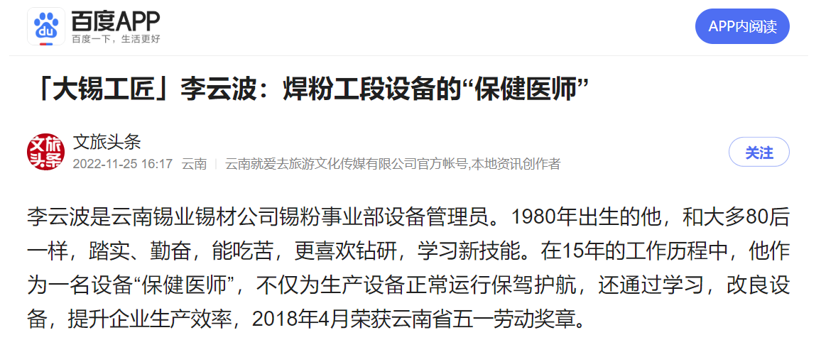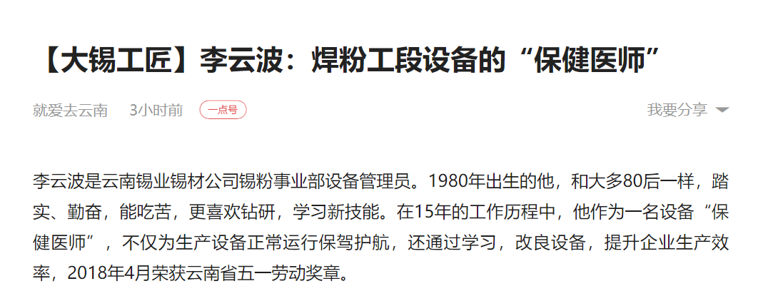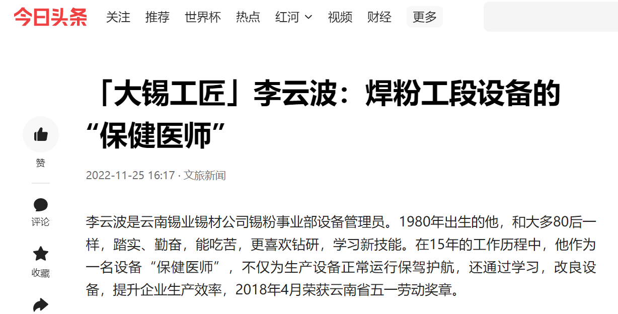 今日头条、网易、一点资讯、百度、文旅头条:【大锡工匠】李云波:焊粉工段设备的“保健医师”
