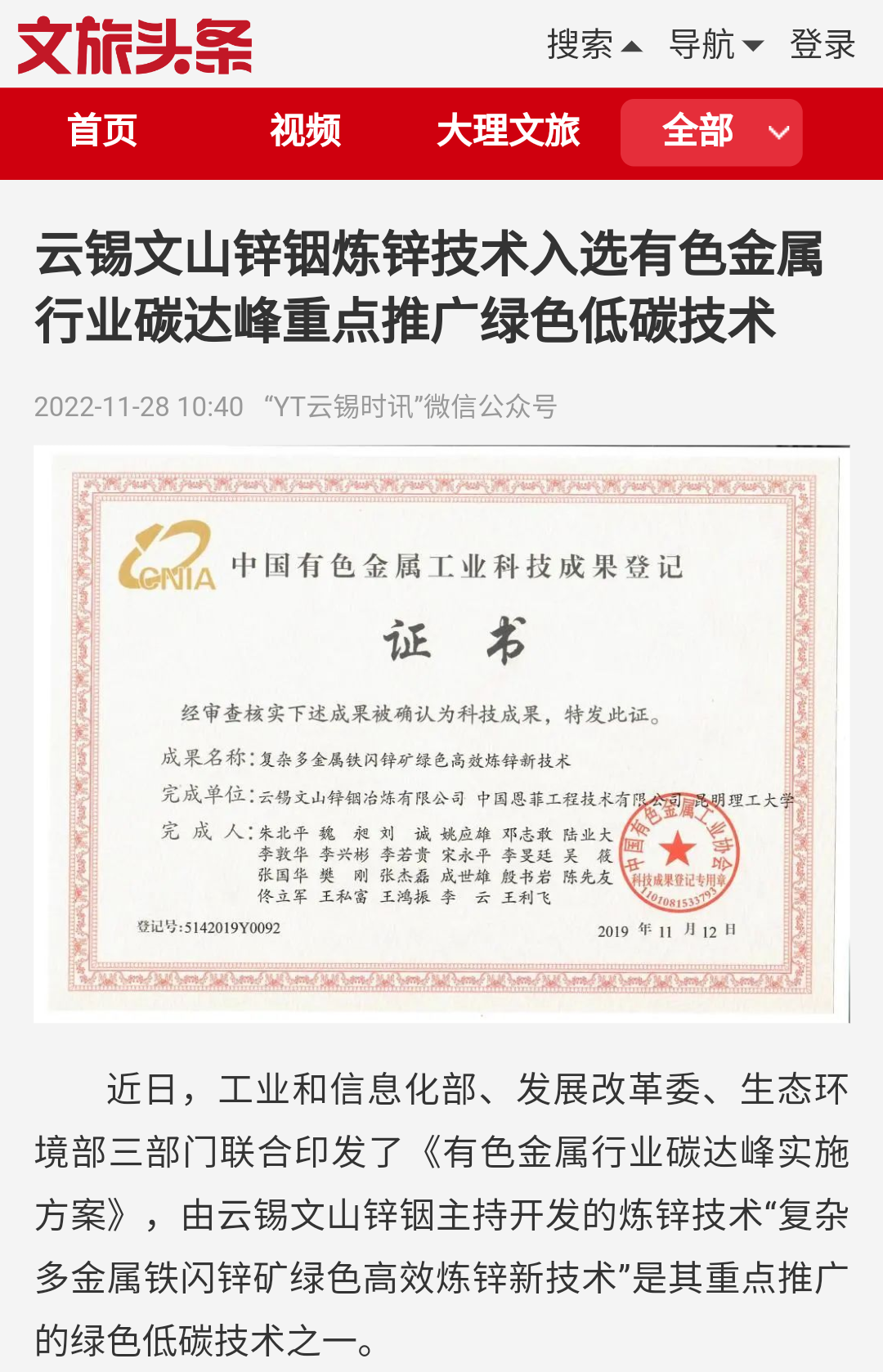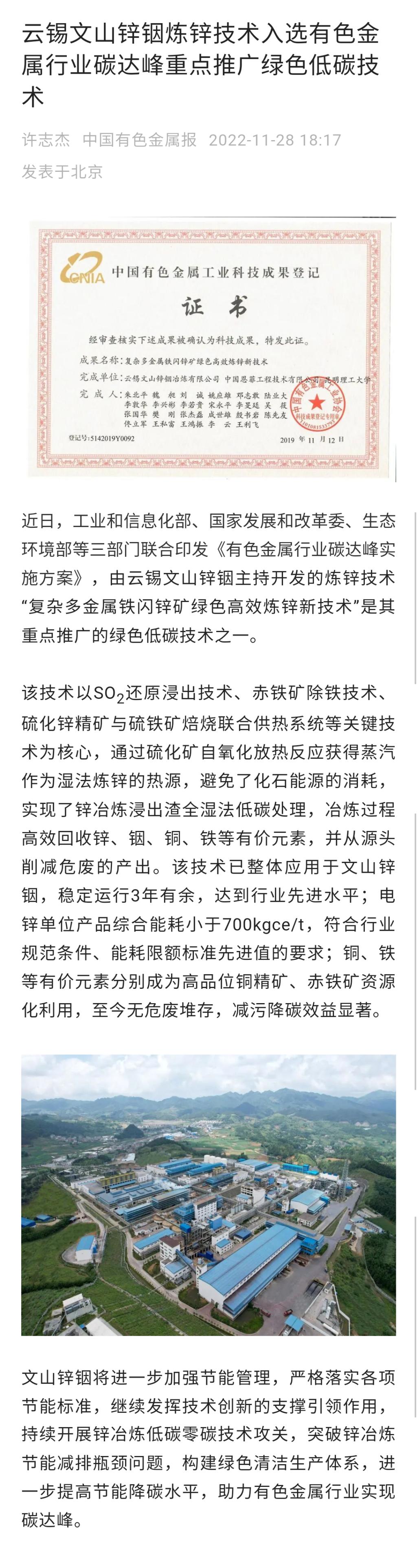 中国有色金属报、文旅头条:云锡文山锌铟炼锌技术入选有色金属行业碳达峰重点推广绿色低碳技术