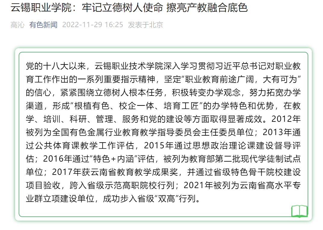 中国有色金属报、有色新闻:云锡职业学院牢记立德树人使命 擦亮产教融合底色