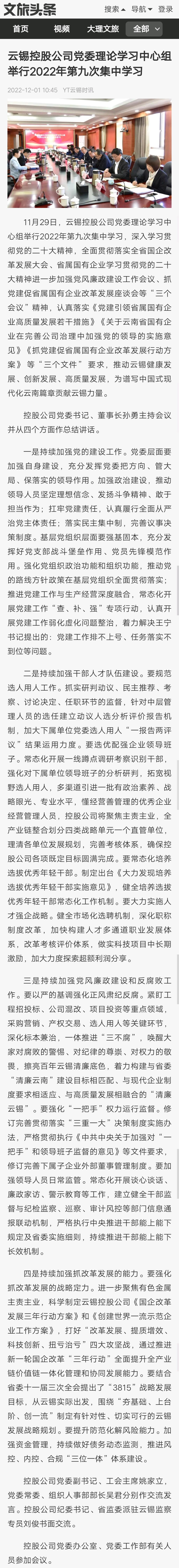 文旅头条:云锡控股公司党委理论学习中心组举行2022年第九次集中学习