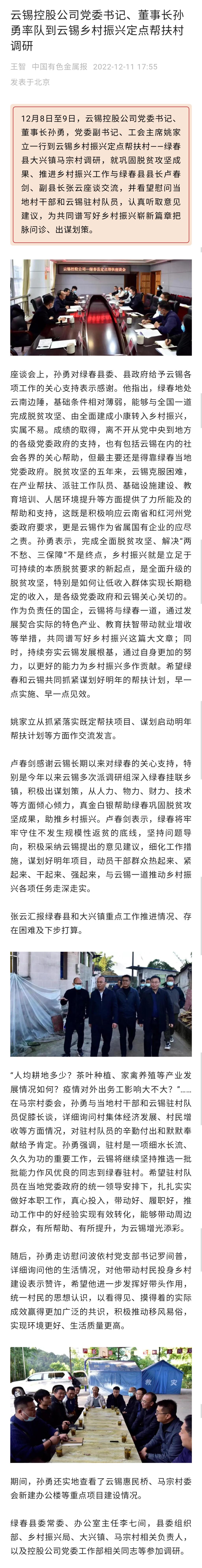 云南政协报、中国有色金属报:云锡控股公司党委书记、董事长孙勇率队到云锡乡村振兴定点帮扶村调研