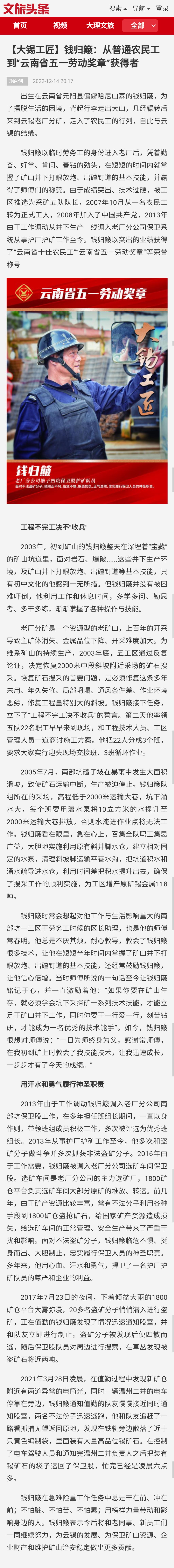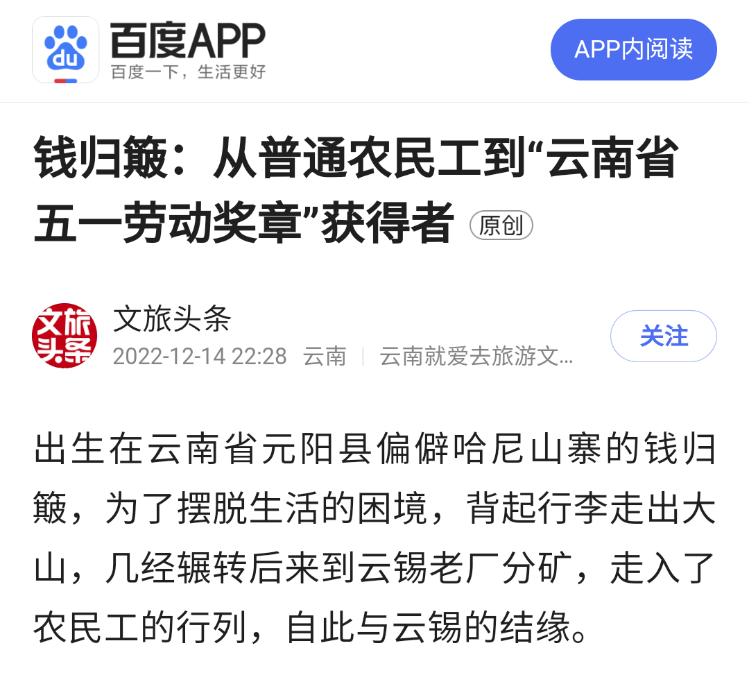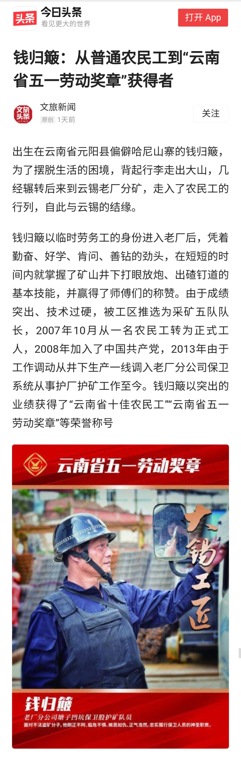 今日头条、百度、一点资讯、网易、文旅头条:【大锡工匠】钱归簸:从普通农民工到“云南省五一劳动奖章”获得者
