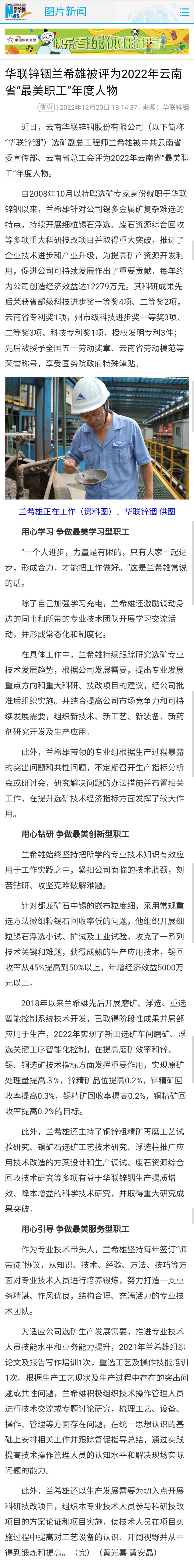 新华网:华联锌铟兰希雄被评为2022年云南省“最美职工”年度人物