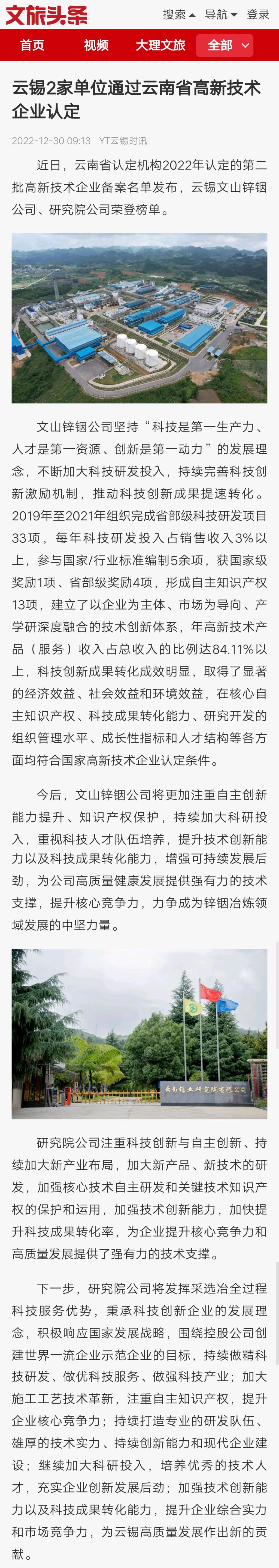 文旅头条:云锡2家单位通过云南省高新技术企业认定