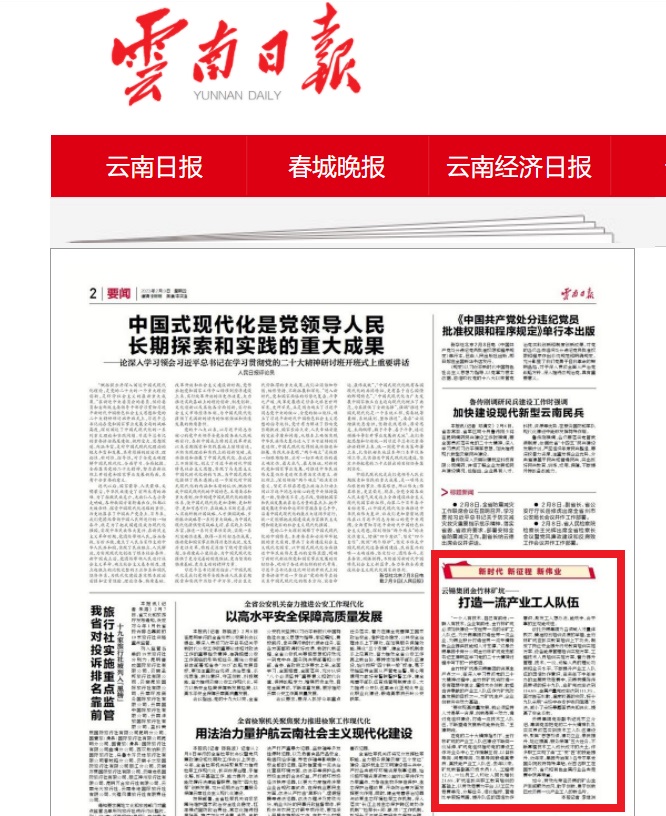 云锡集团党委副书记姚家立介绍,集团党委把党的二十大精神扎扎实实贯彻落实到技术工人队伍建设中,聚焦“思想引领、建功立业、素质提升、地位提高、服务保障”五大任务,不断厚植技术工人成长成才的沃土,许多职工实现了由“工”变“匠”的技能提升。近年来,集团先后有3名专家享受国务院政府特殊津贴,近百名职工在国家级、省级和有色金属行业各类竞赛中获得荣誉。