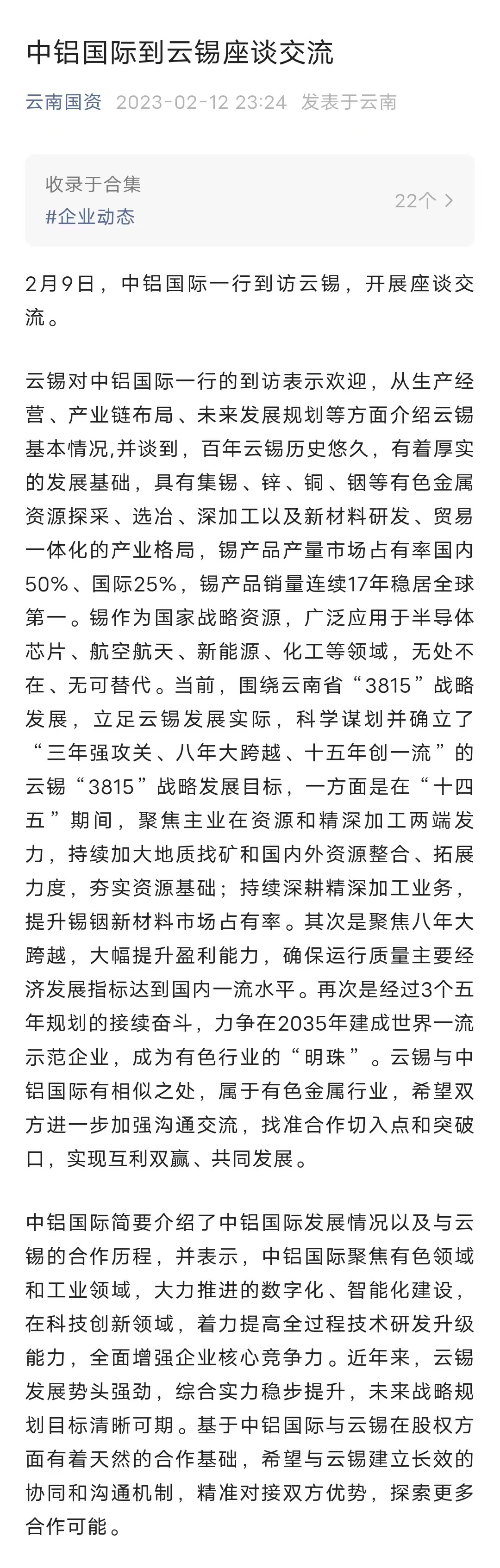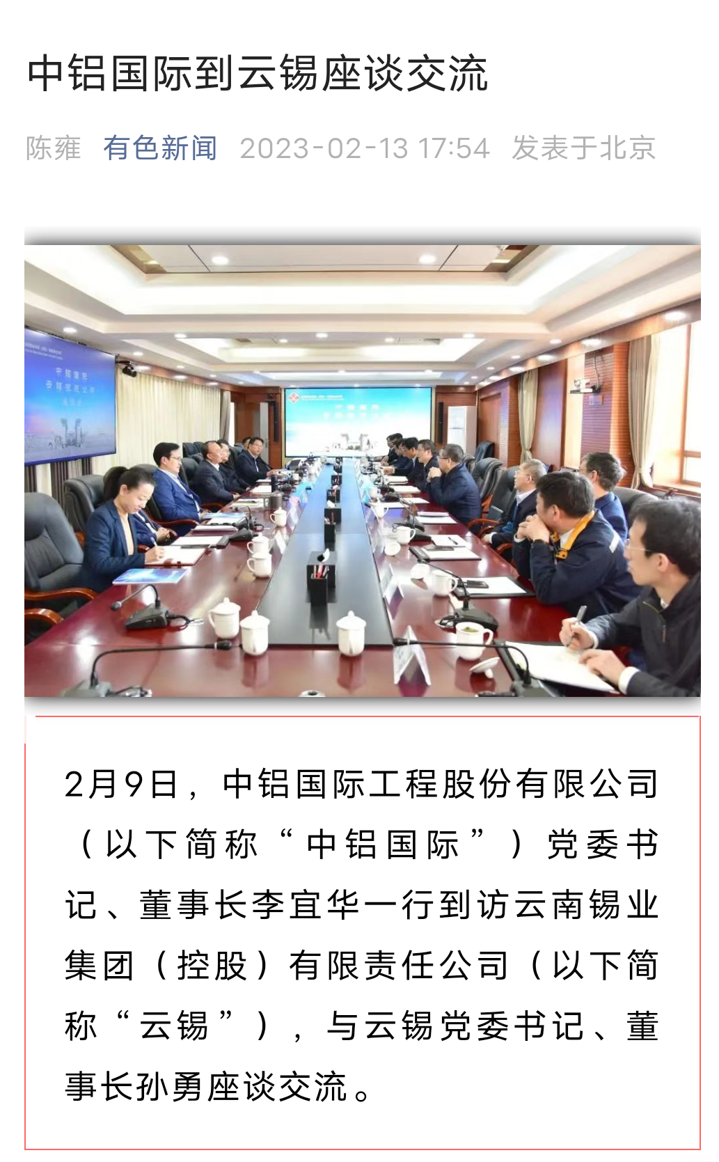 云南国资、有色新闻:中铝国际到云锡座谈交流