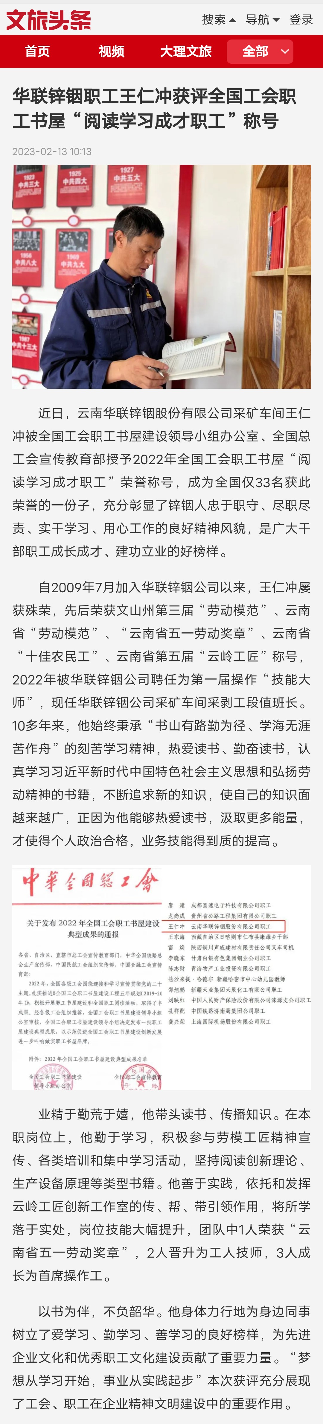 文旅头条:华联锌铟职工王仁冲获评全国工会职工书屋“阅读学习成才职工”称号