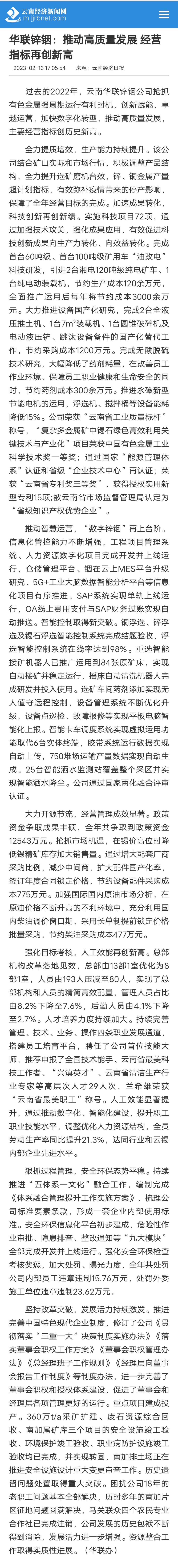 云南经济日报:华联锌铟推动高质量发展 经营指标再创新高