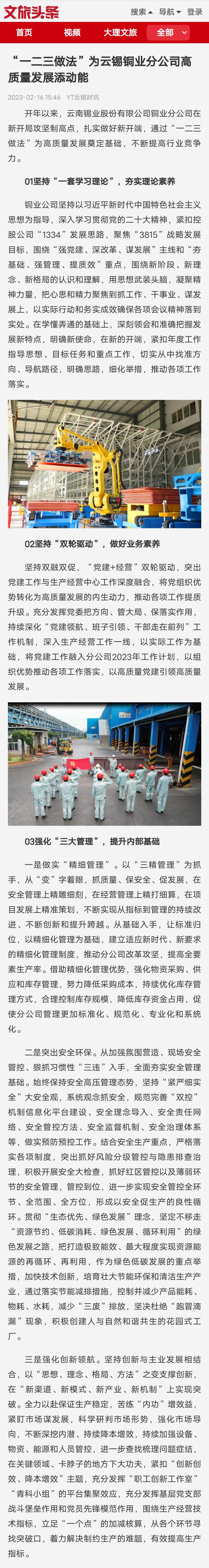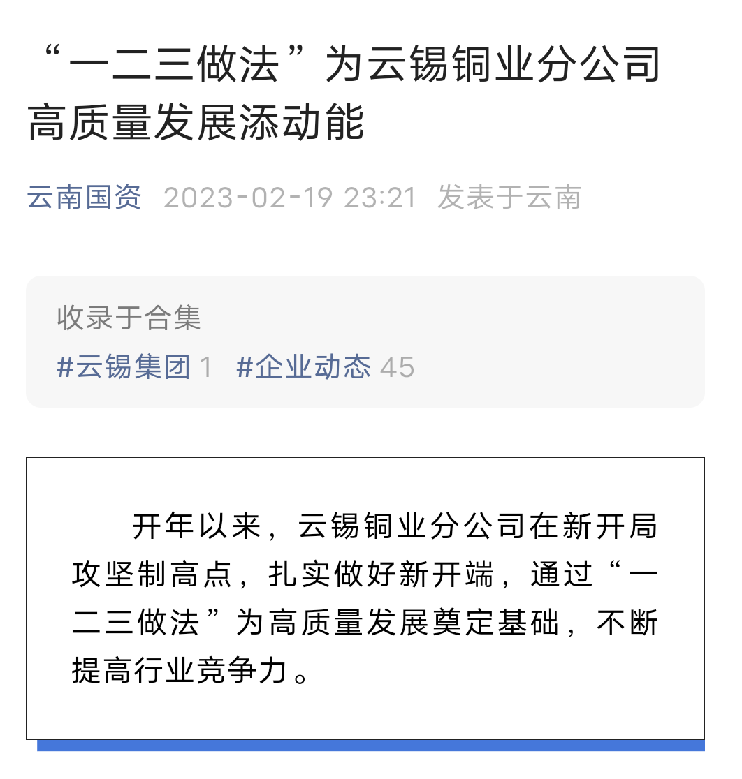 云南国资、文旅头条:“一二三做法”为云锡铜业分公司高质量发展添动能