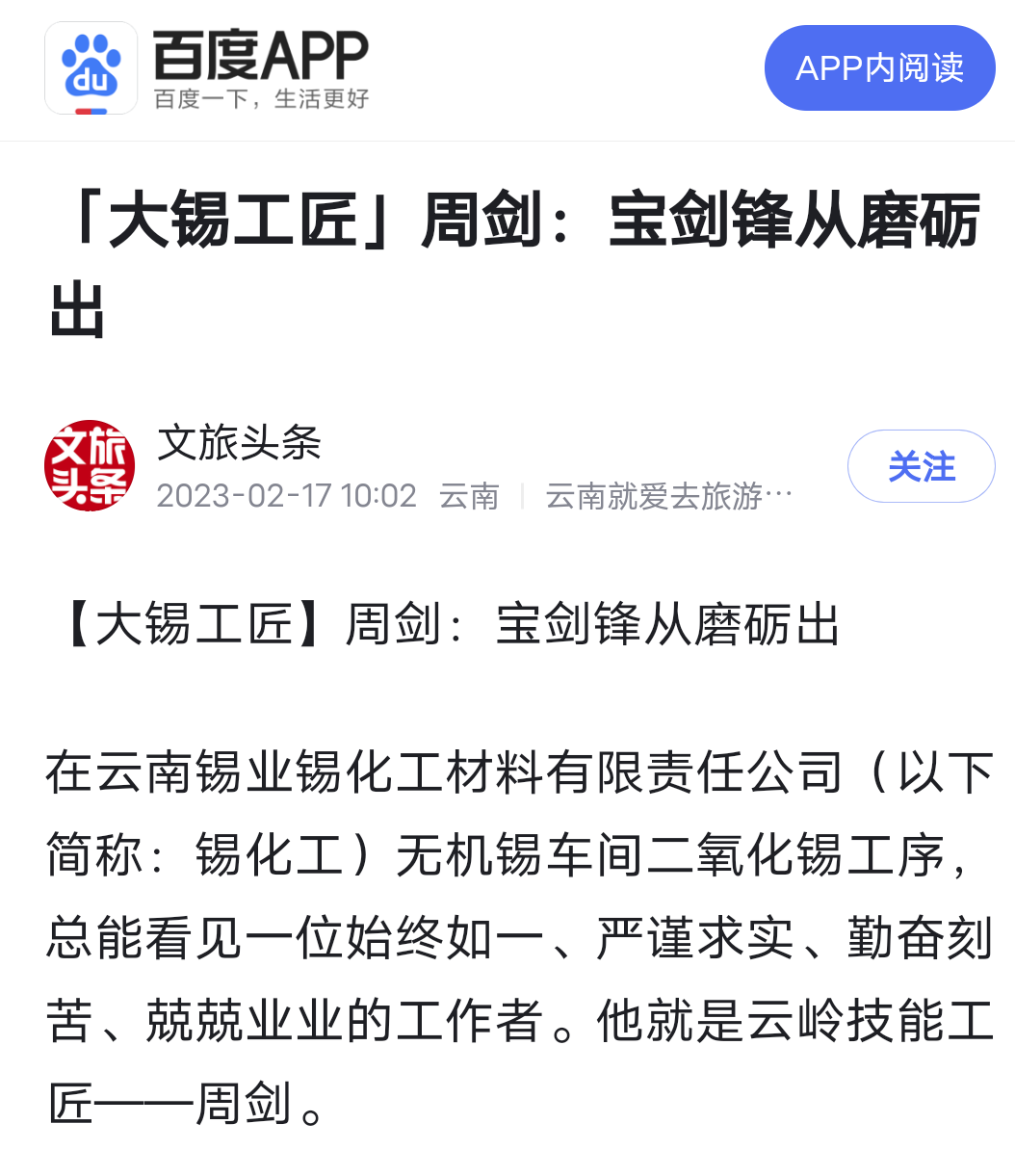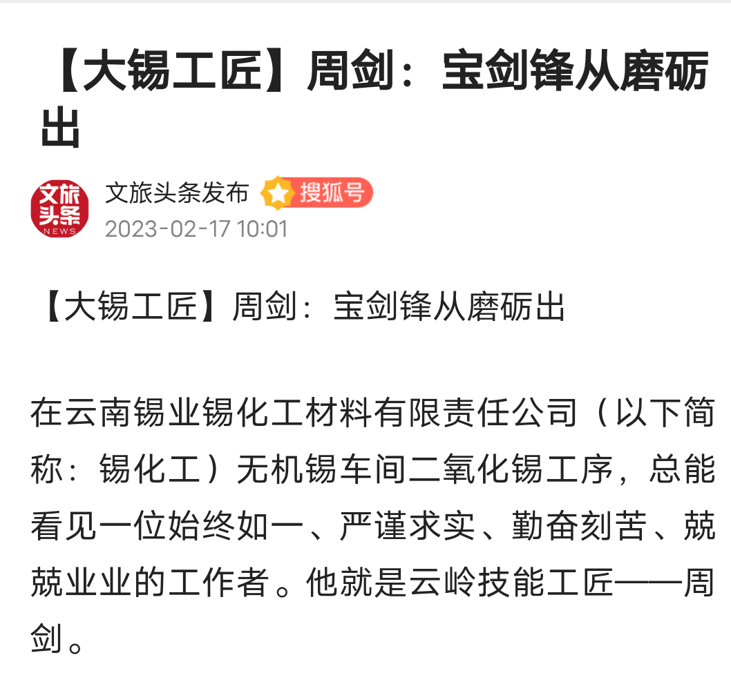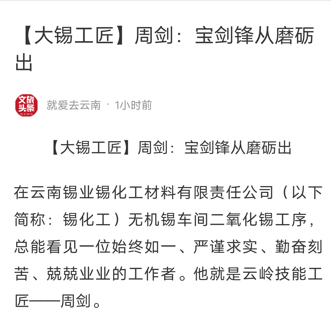 今日头条、百度、网易、搜狐、一点资讯、文旅头条:【大锡工匠】周剑:宝剑锋从磨砺出