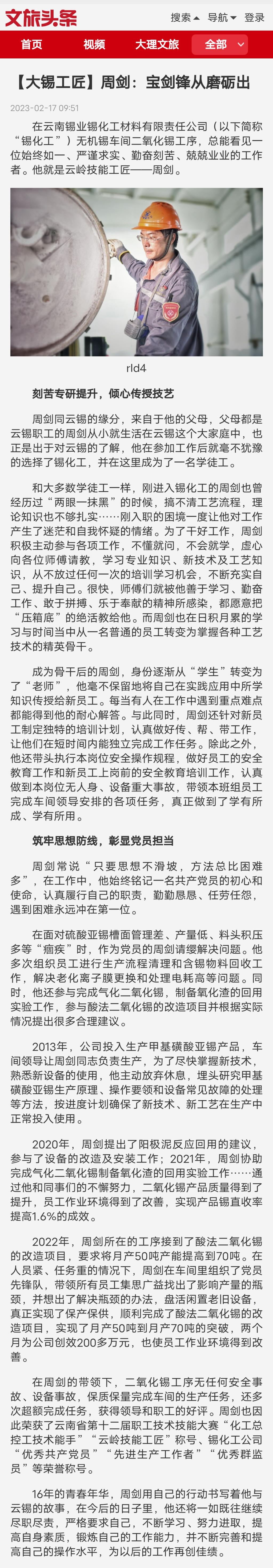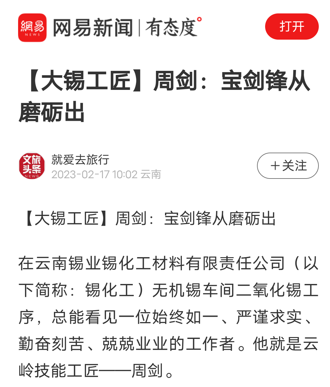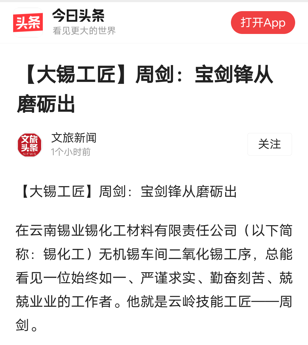 今日头条、百度、网易、搜狐、一点资讯、文旅头条:【大锡工匠】周剑:宝剑锋从磨砺出