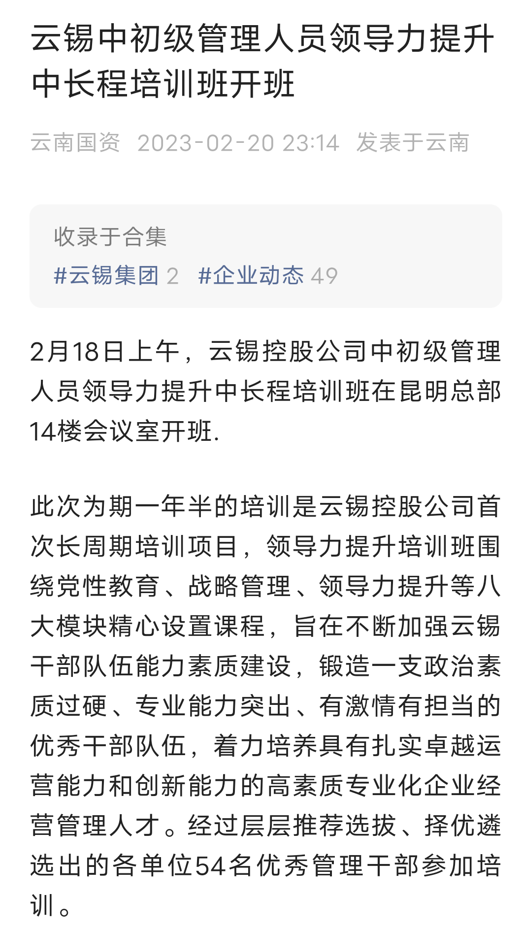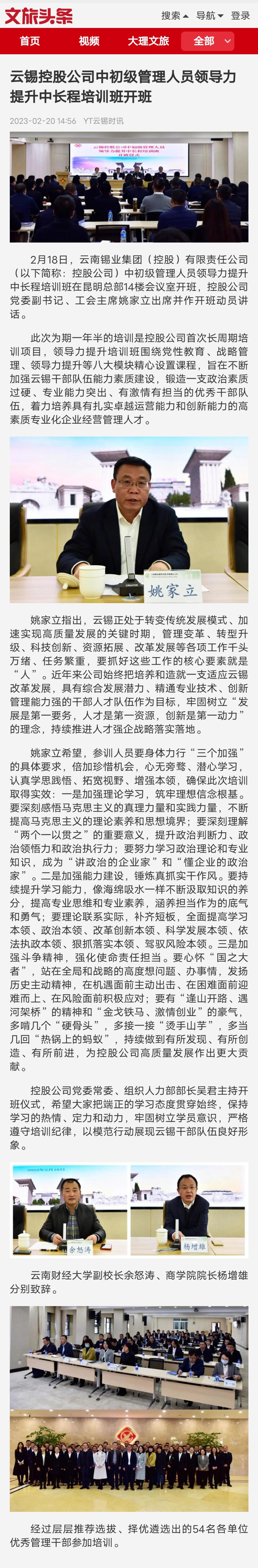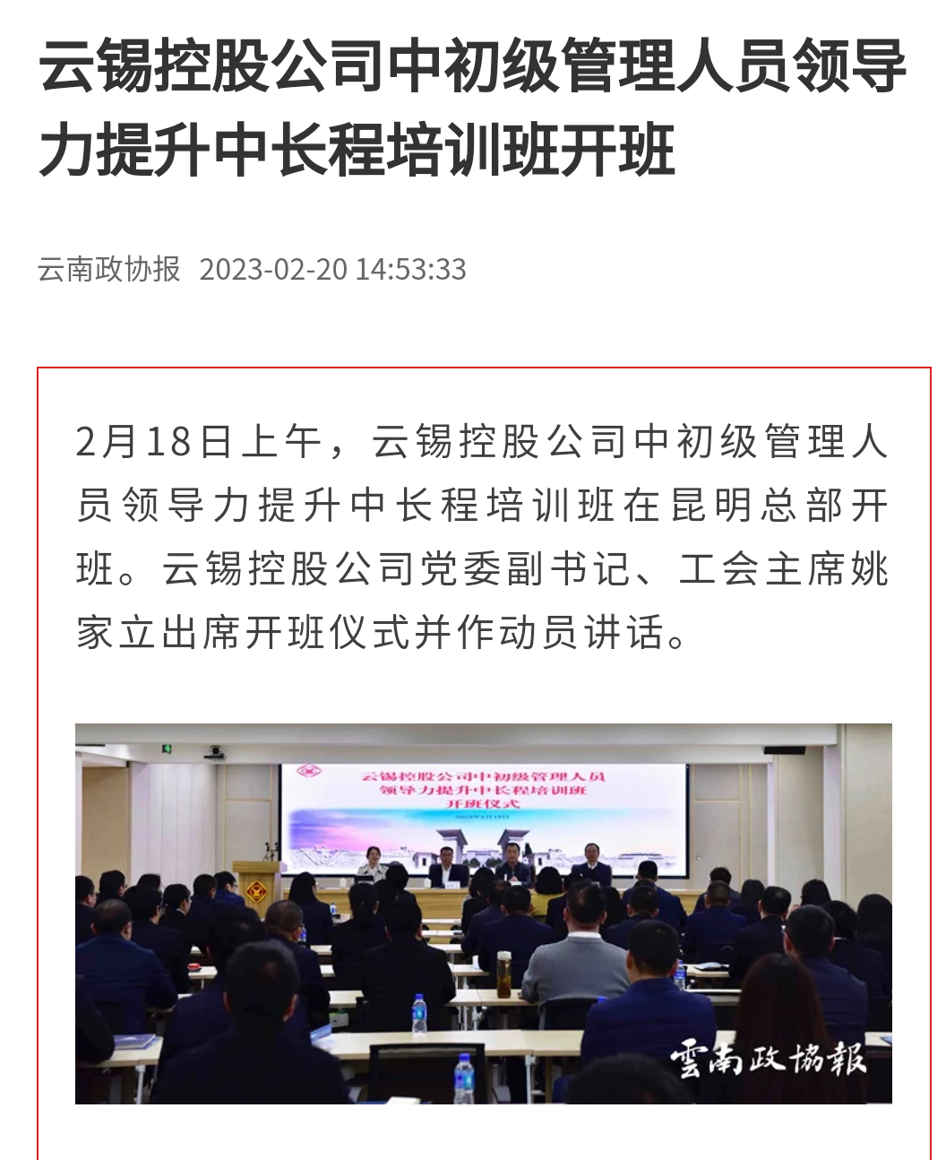 云南国资、云南政协报、中国有色金属报、文旅头条:云锡控股公司中初级管理人员领导力提升中长程培训班开班