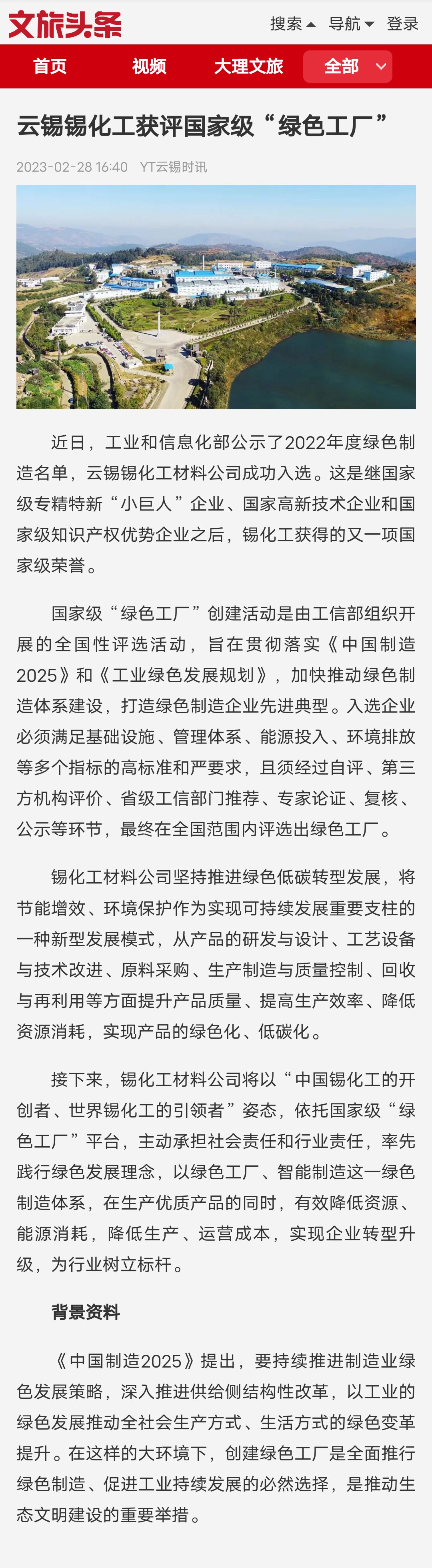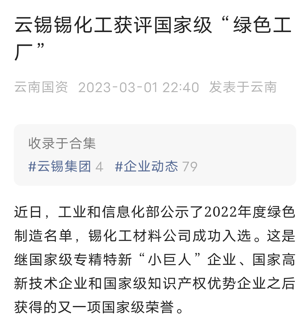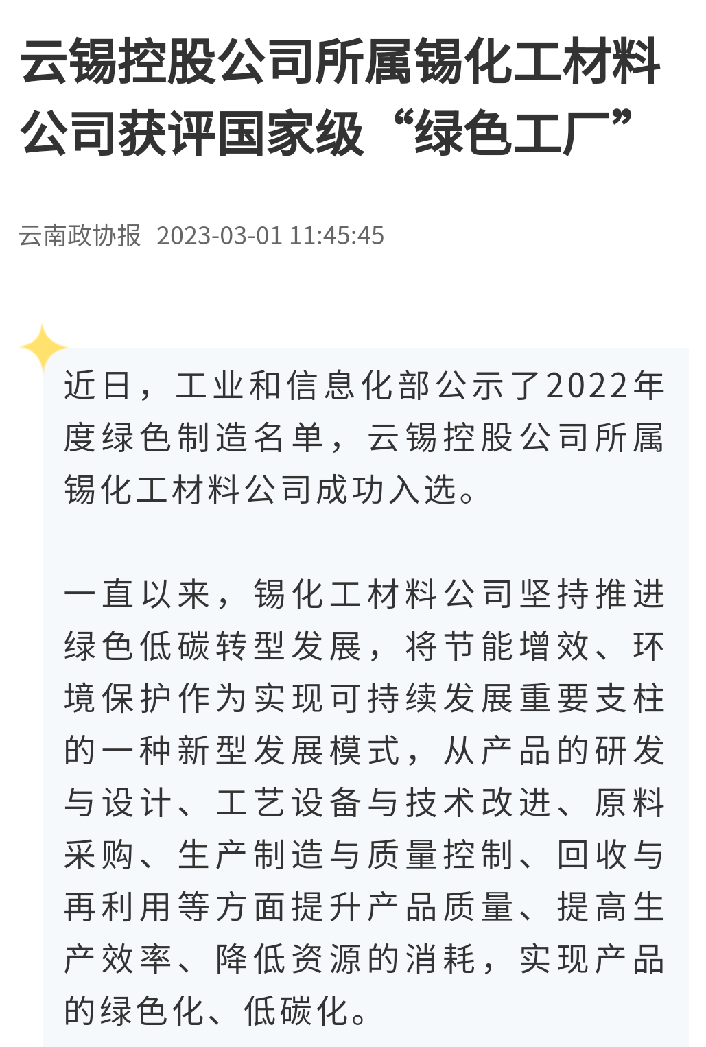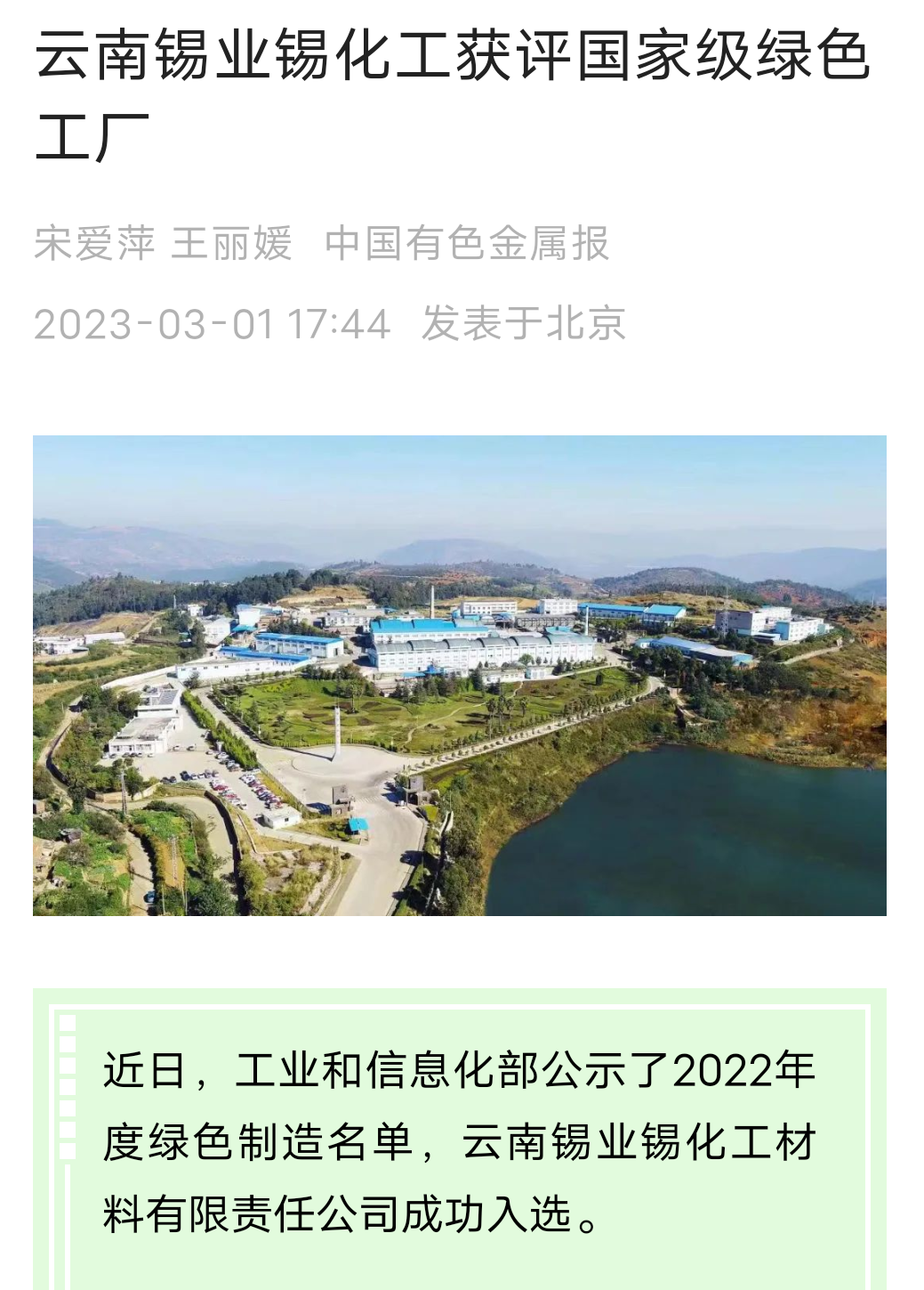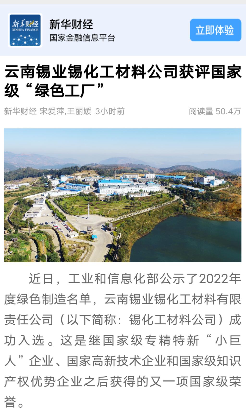 新华财经、云南国资、云南政协报、中国有色金属报、文旅头条:云南锡业锡化工材料公司获评国家级“绿色工厂”