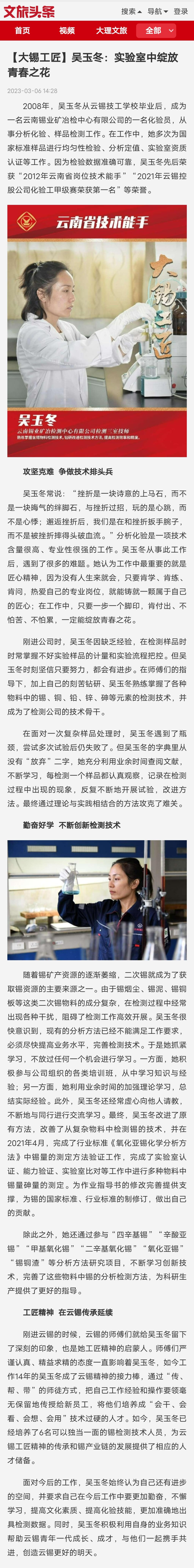 今日头条、百度、文旅头条:【大锡工匠】吴玉冬:实验室中绽放青春之花