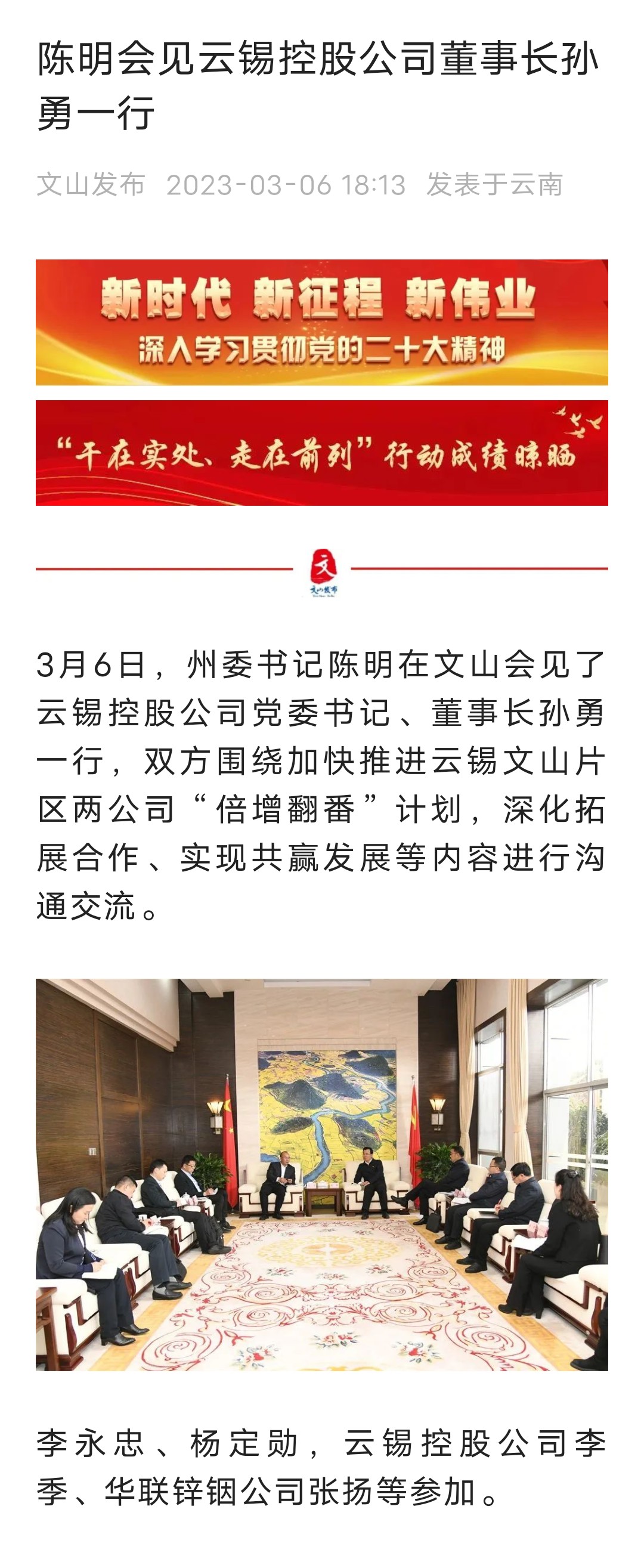 文山发布:陈明会见云锡控股公司董事长孙勇一行