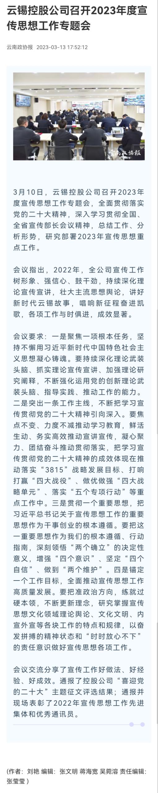 云南政协报 :云锡控股公司召开2023年度宣传思想工作专题会