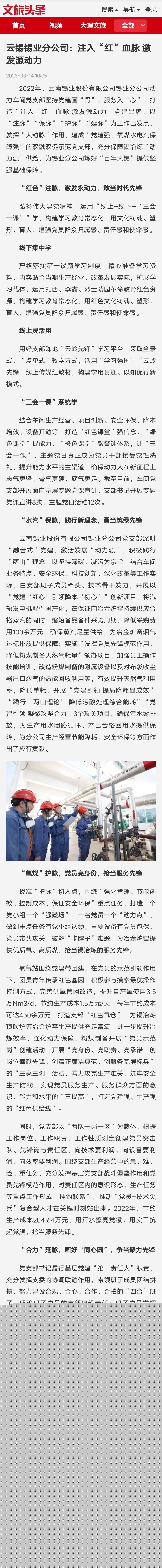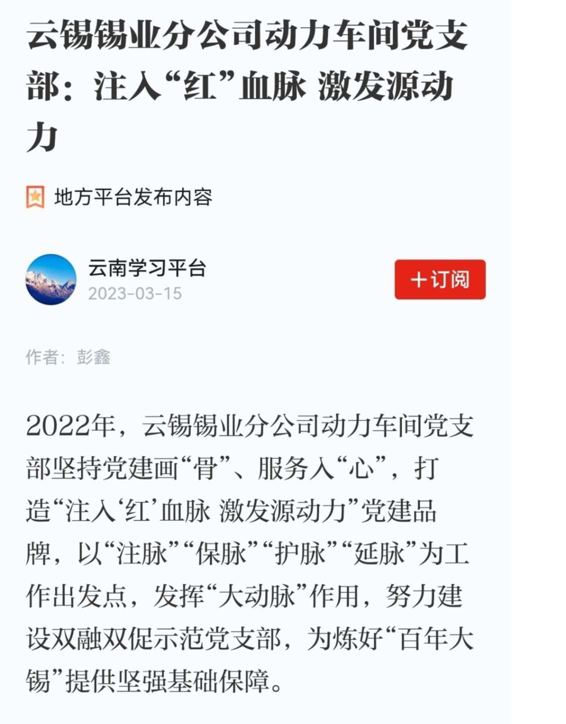 学习强国、文旅头条:云锡锡业分公司动力车间党支部:注入“红”血脉 激发源动力