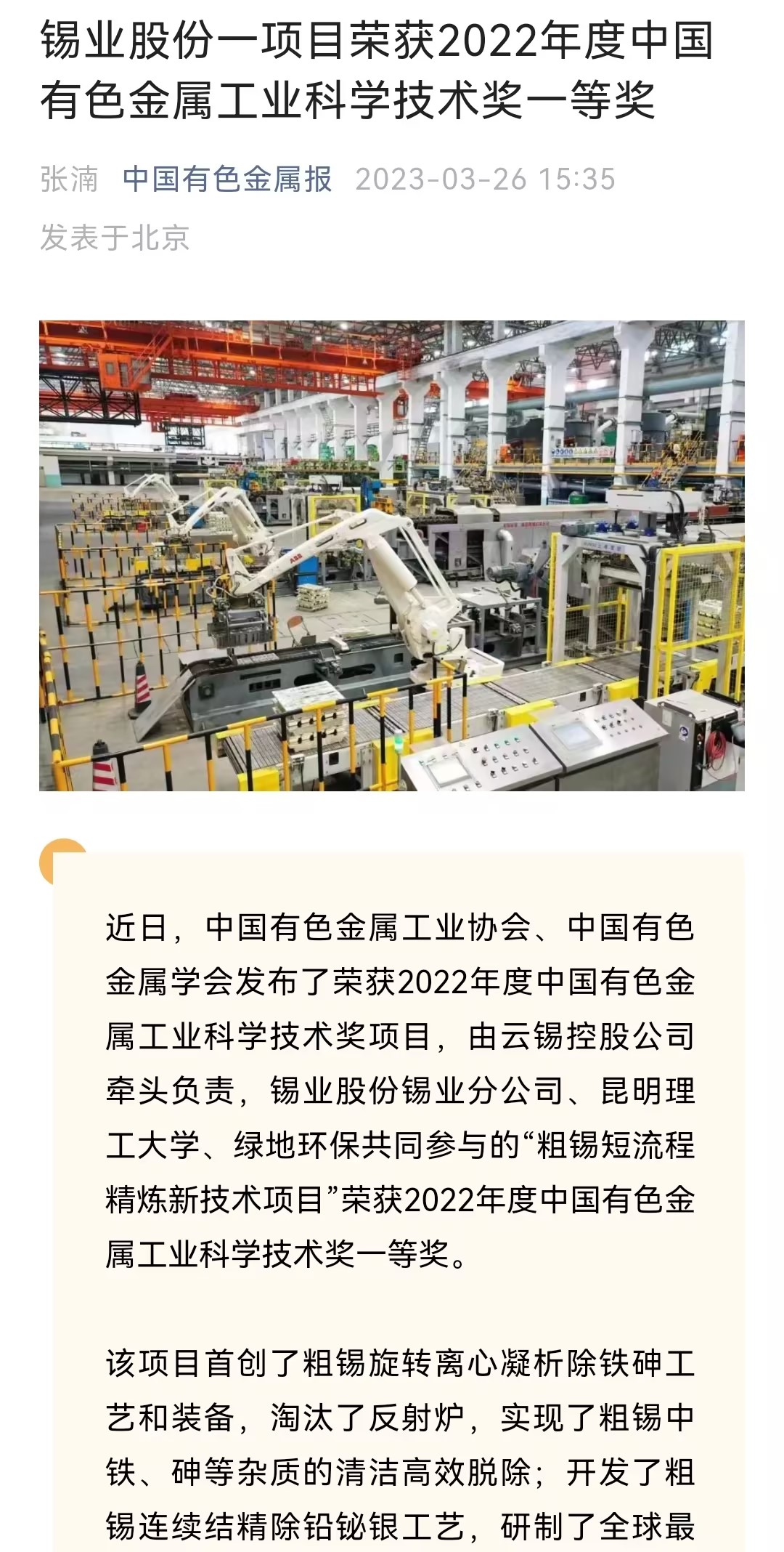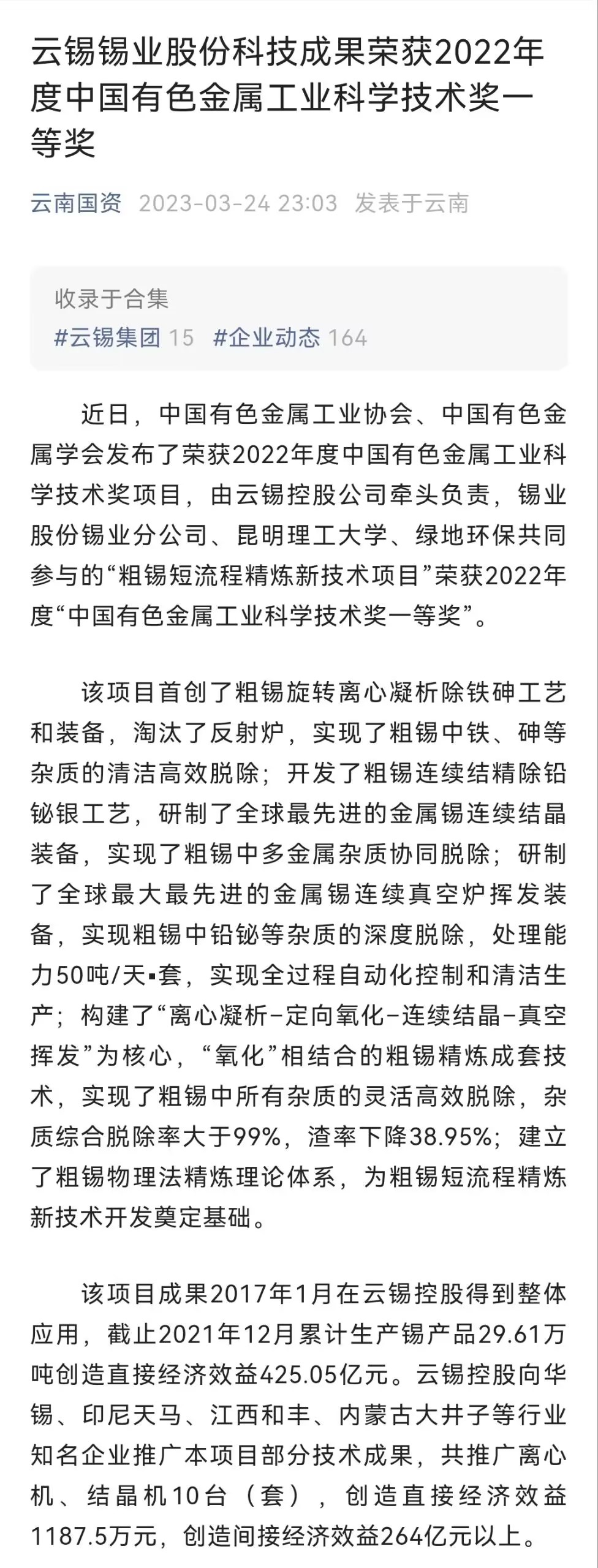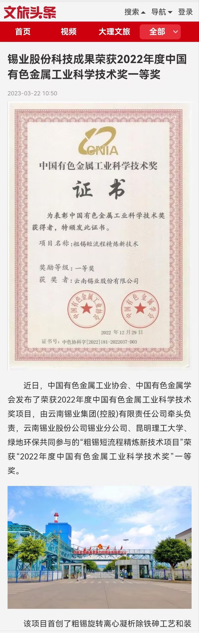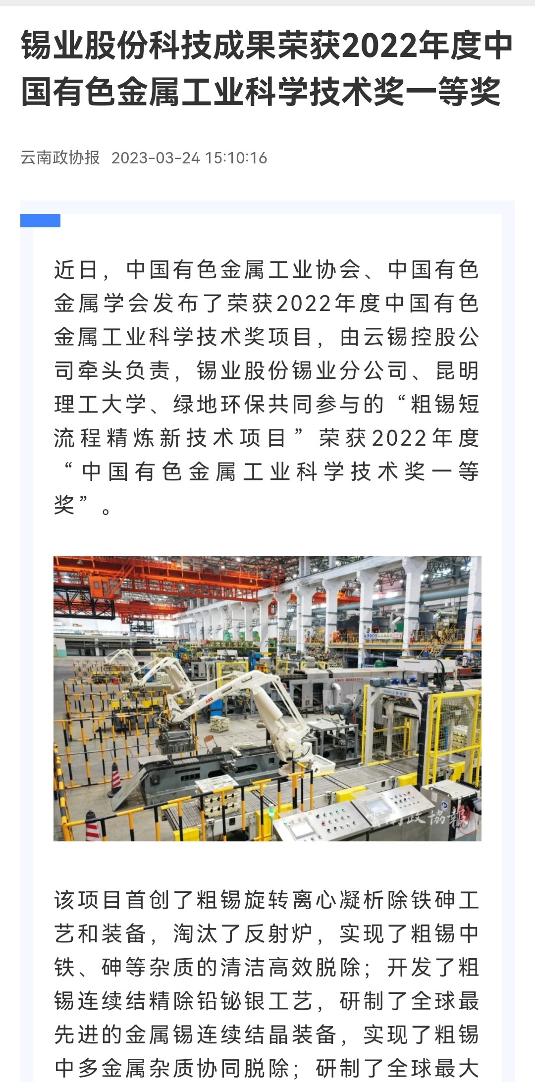 云南国资、中国有色金属报、云南政协报、文旅头条:锡业股份科技成果荣获2022年度中国有色金属工业科学技术奖一等奖