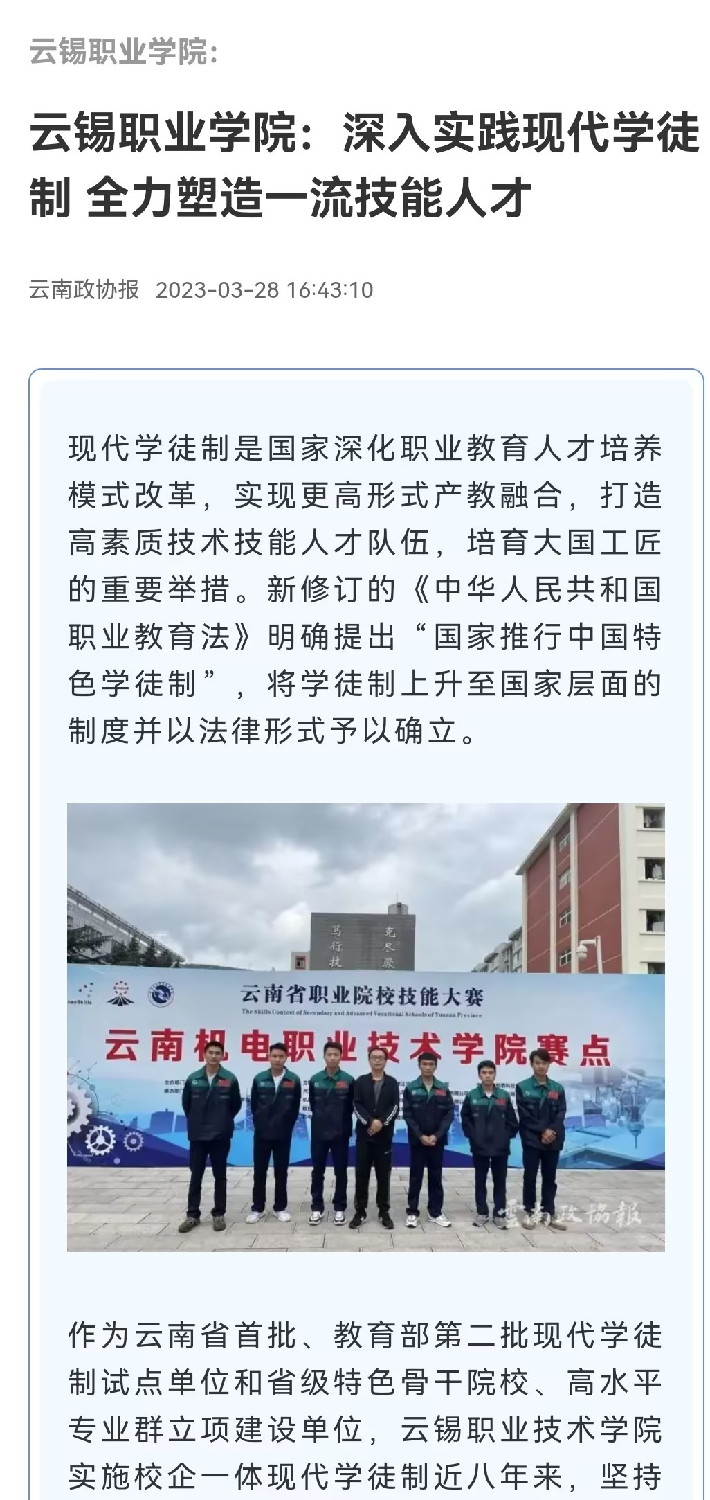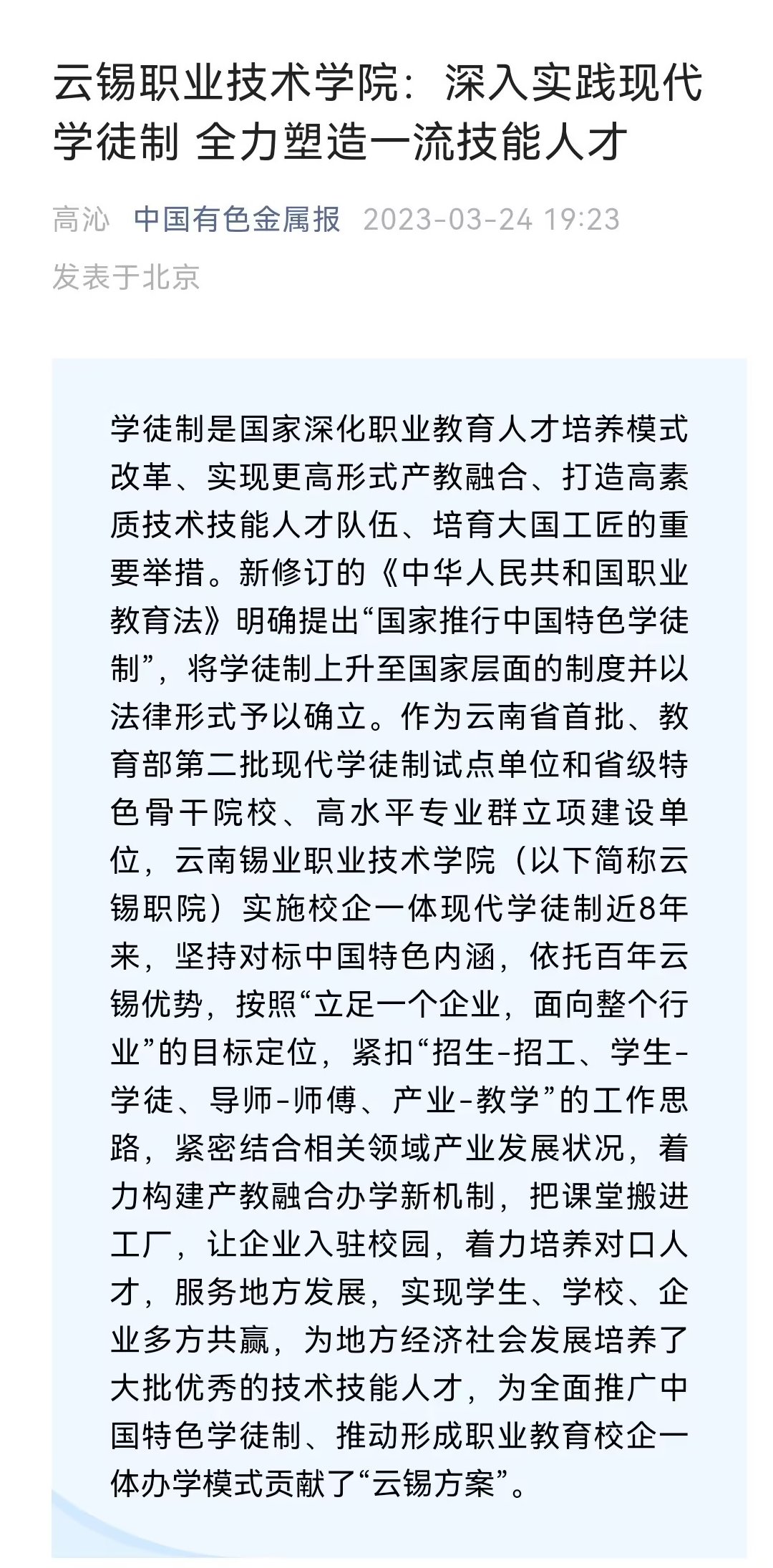 中国有色金属报、云南政协报、文旅头条:云锡职业技术学院深入实践现代学徒制 全力塑造一流技能人才