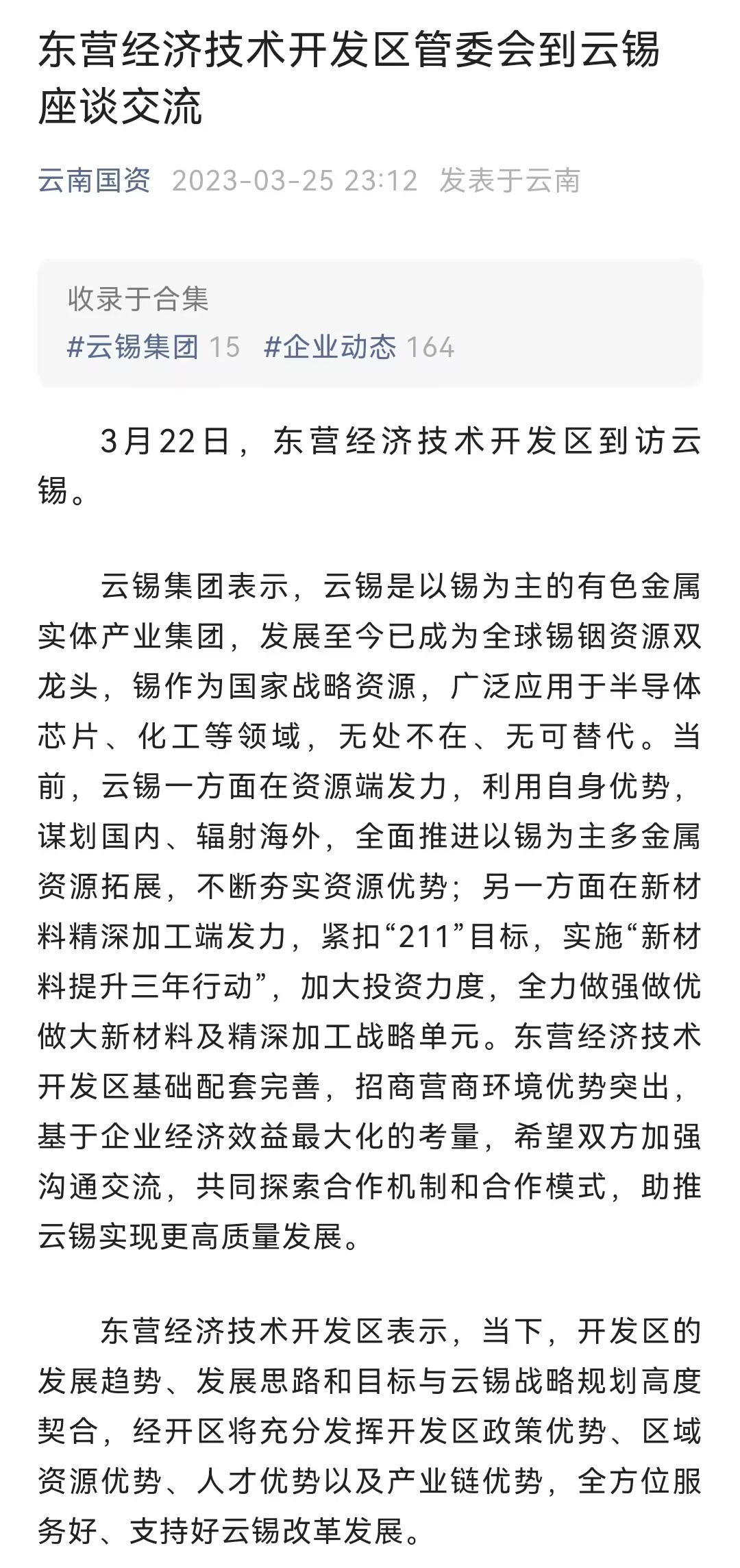 云南国资:东营经济技术开发区管委会到云锡座谈交流