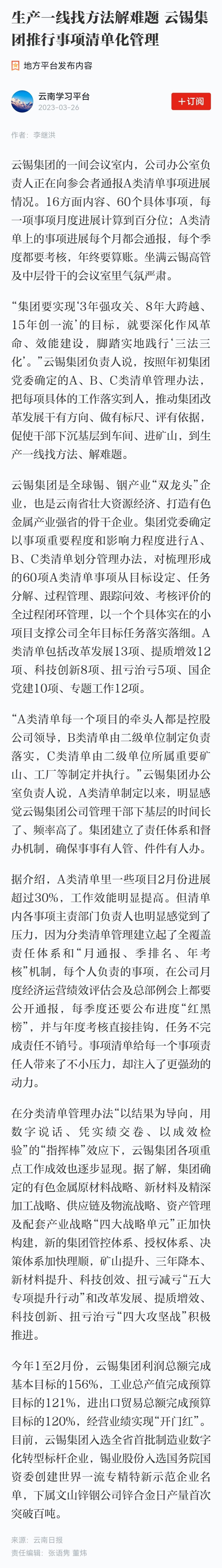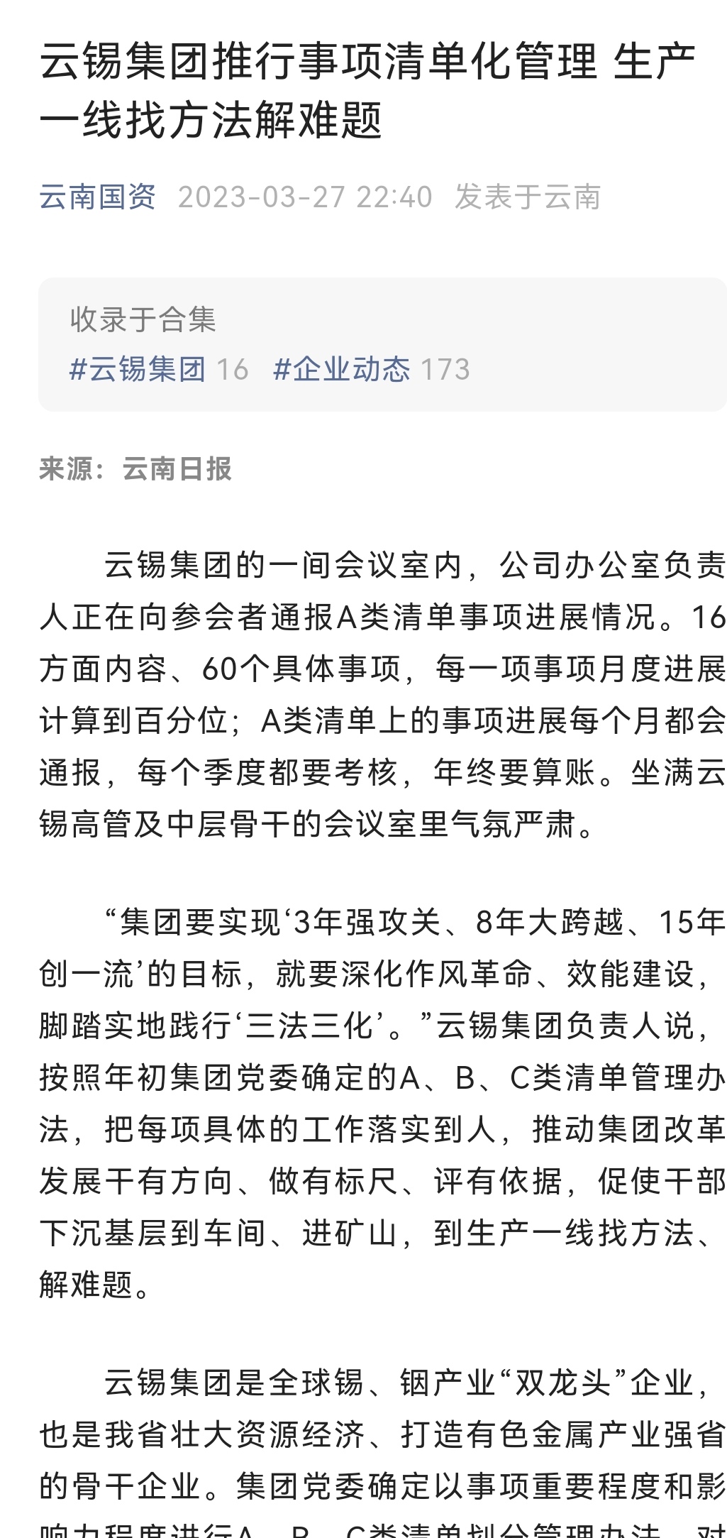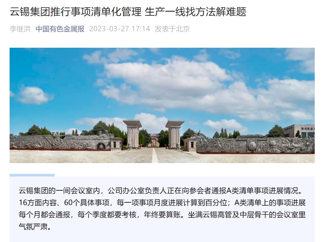 学习强国、新华财经、云南国资、中国有色金属报:云锡集团推行事项清单化管理 生产一线找方法解难题